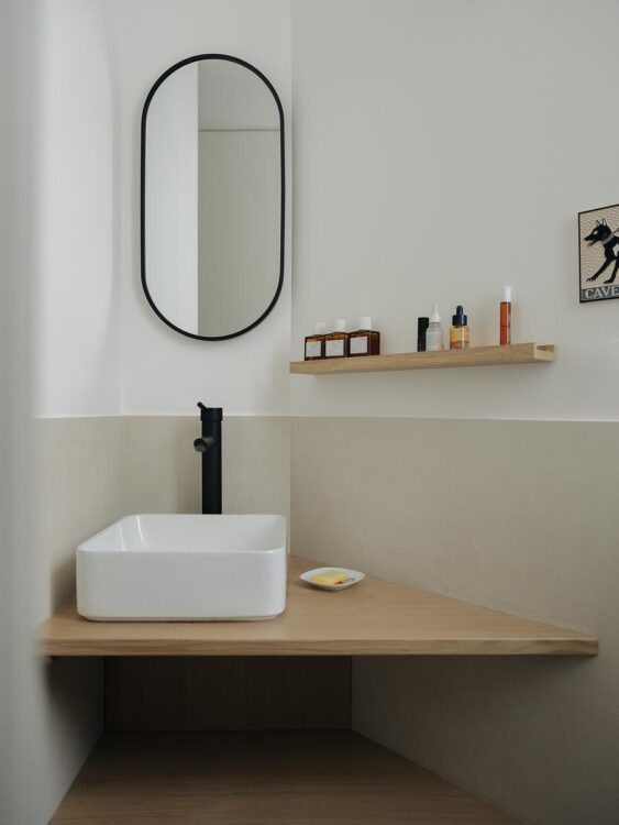 La pièce d’eau, installée à l’emplacement de l’ancienne cuisine, se pare de grands carreaux qui habillent l’ensemble de ses murs et lui confèrent une présence minérale et apaisante.