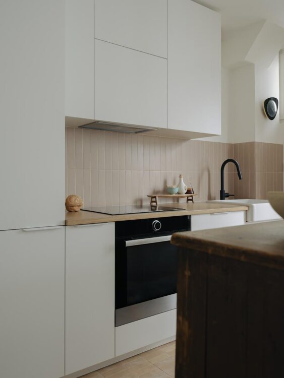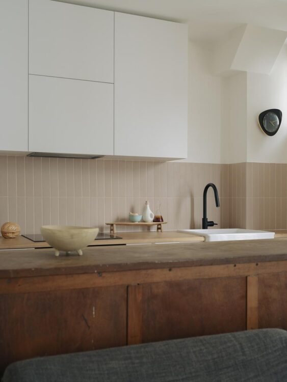 Place à la cuisine, un espace ouvert où les équipements s’adaptent avec justesse aux nouvelles lignes qui structurent l’espace. En touche de couleur, des carreaux de terre cuite viennent réchauffer l’ensemble.