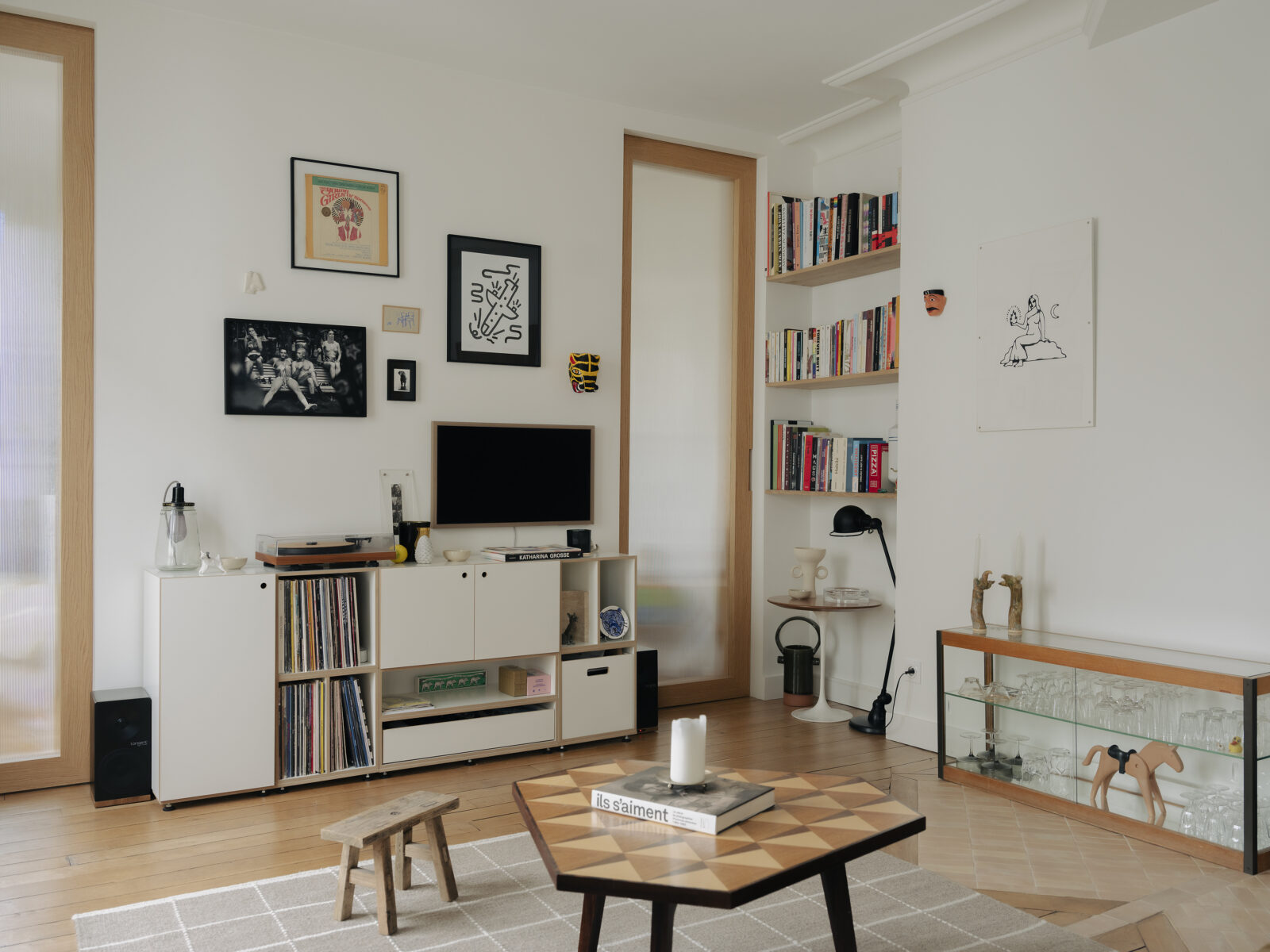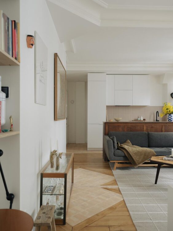 Révélant des perspectives traversantes où la lumière se diffuse librement et souligne les volumes comme les lignes de fuite, ce dispositif rend hommage à l’organisation classique des pièces en enfilade, historiquement conçues pour laisser filer le regard d’un bout à l’autre de l’habitation.