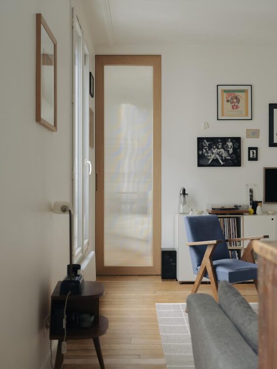 Les deux grandes portes à galandage en verre strié permettent de faire disparaître partiellement le cloisonnement. Elles laissent ainsi la lumière circuler entre le double séjour et la chambre.