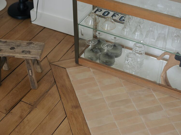 En dialogue avec les carreaux, l’ancien parquet a été conservé, entièrement poncé puis verni.