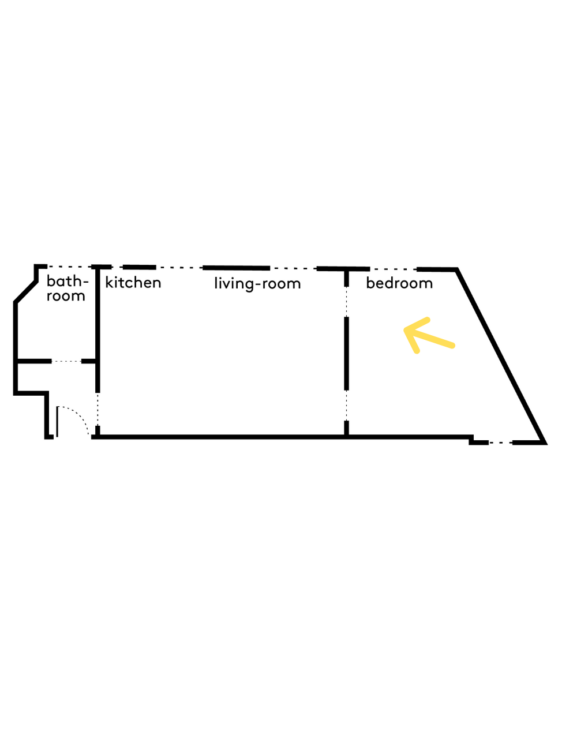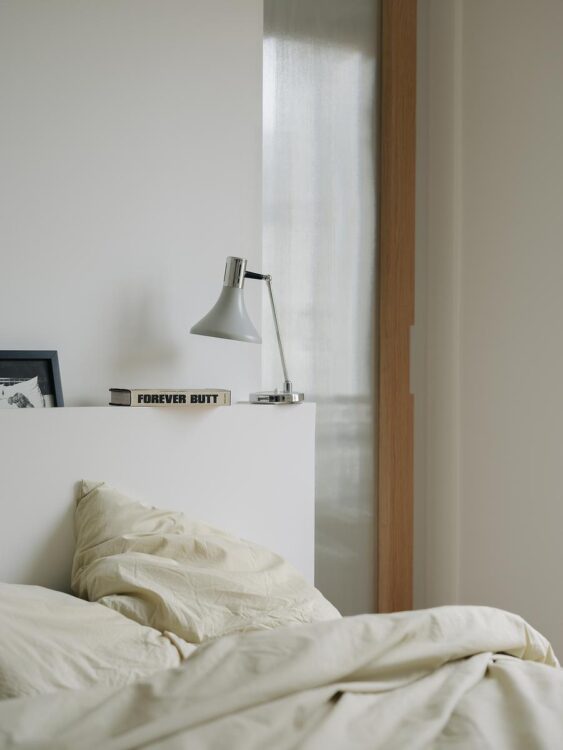 Côté chambre, la tête de lit apporte de nouveaux rangements, tandis que la lumière, filtrée par la porte en verre strié, renforce la sensation d’espace et de légèreté.