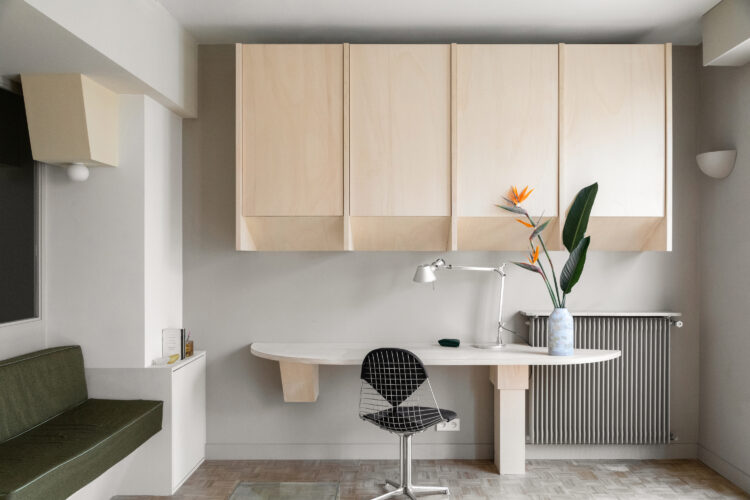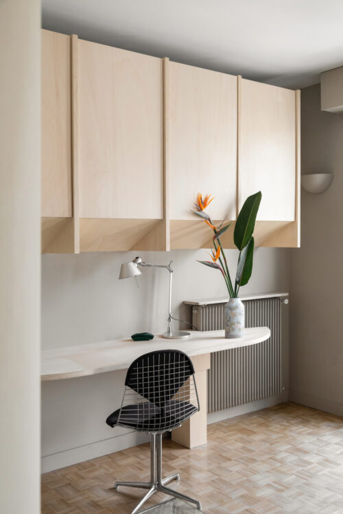 Un espace de travail a été intégré, pensé comme une micro-architecture dans le salon. Un grand plateau, presque en porte à faux, s’insère sous des massifs de rangements en bois qui semblent léviter à distance du plafond. Un subtil équilibre lie les éléments entre eux.