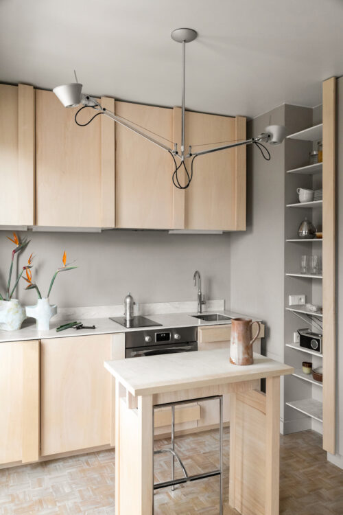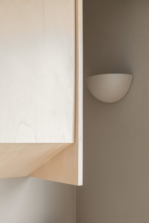 L’architecte Jules Brisson utilise volontairement un vocabulaire d’éléments simples, mis en tension par des assemblages soignés. La rigueur du détail devient ici une esthétique à part entière. La demi-sphère de la lampe répond, par exemple, à la géométrie triangulaire des placards sur mesure.