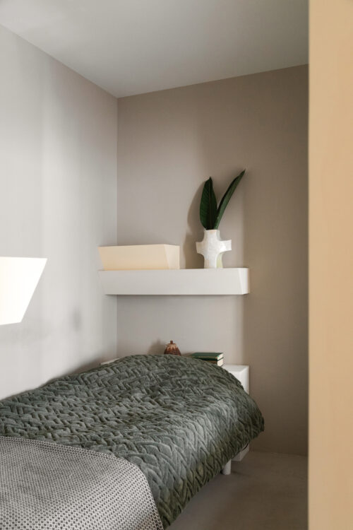 Conçue pour accueillir un lit de 160 centimètres de large, la chambre en alcôve s’inspire du principe du cocon. Le vert Trianon dialogue avec les tons minéraux et crée un refuge apaisant, presque monacal.