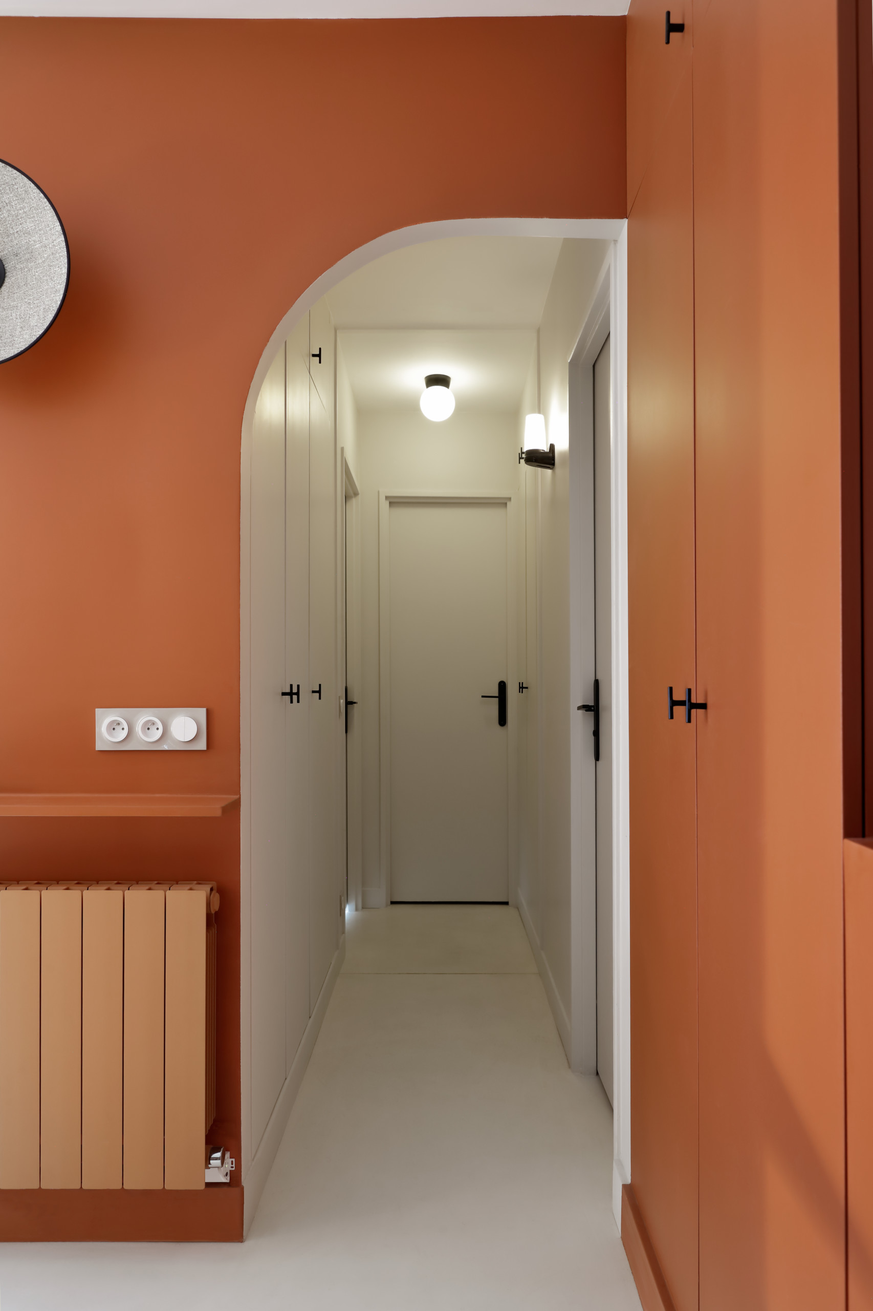 La couleur du placard court jusque sur le mur dans lequel se dessine un passage arqué qui annonce le couloir.