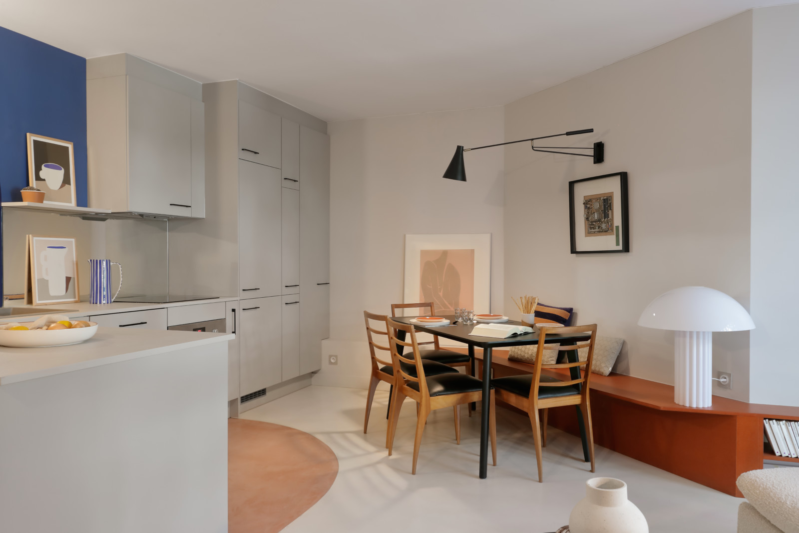 Le coin repas est installé sous une applique articulée. Pour multiplier les assises sans perdre d’espace de circulation, on a conçu une banquette réalisée sur mesure qui se prolonge en meuble TV vers le salon.