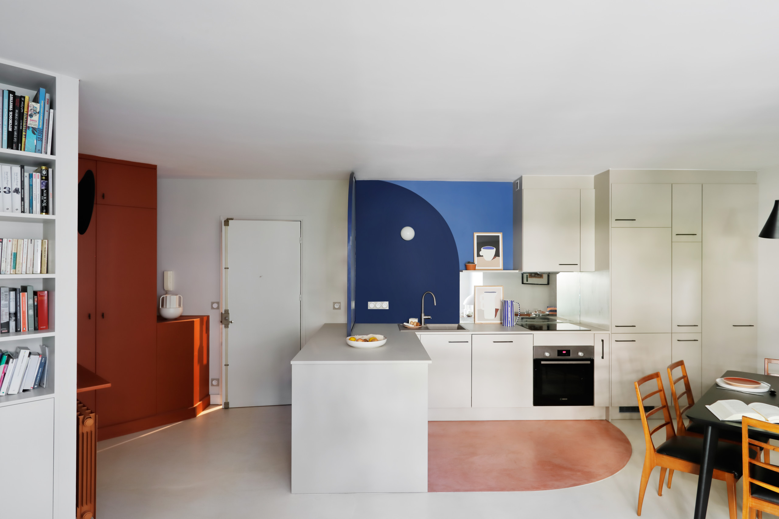 Notre visite s’achève dans l’espace salon, glissé entre la baie et la bibliothèque réalisée sur mesure. Il rassemble les courbes omniprésentes et les couleurs bleue et corail qui animent et délimitent les divers espaces de vie, comme une belle conclusion à l’appartement.