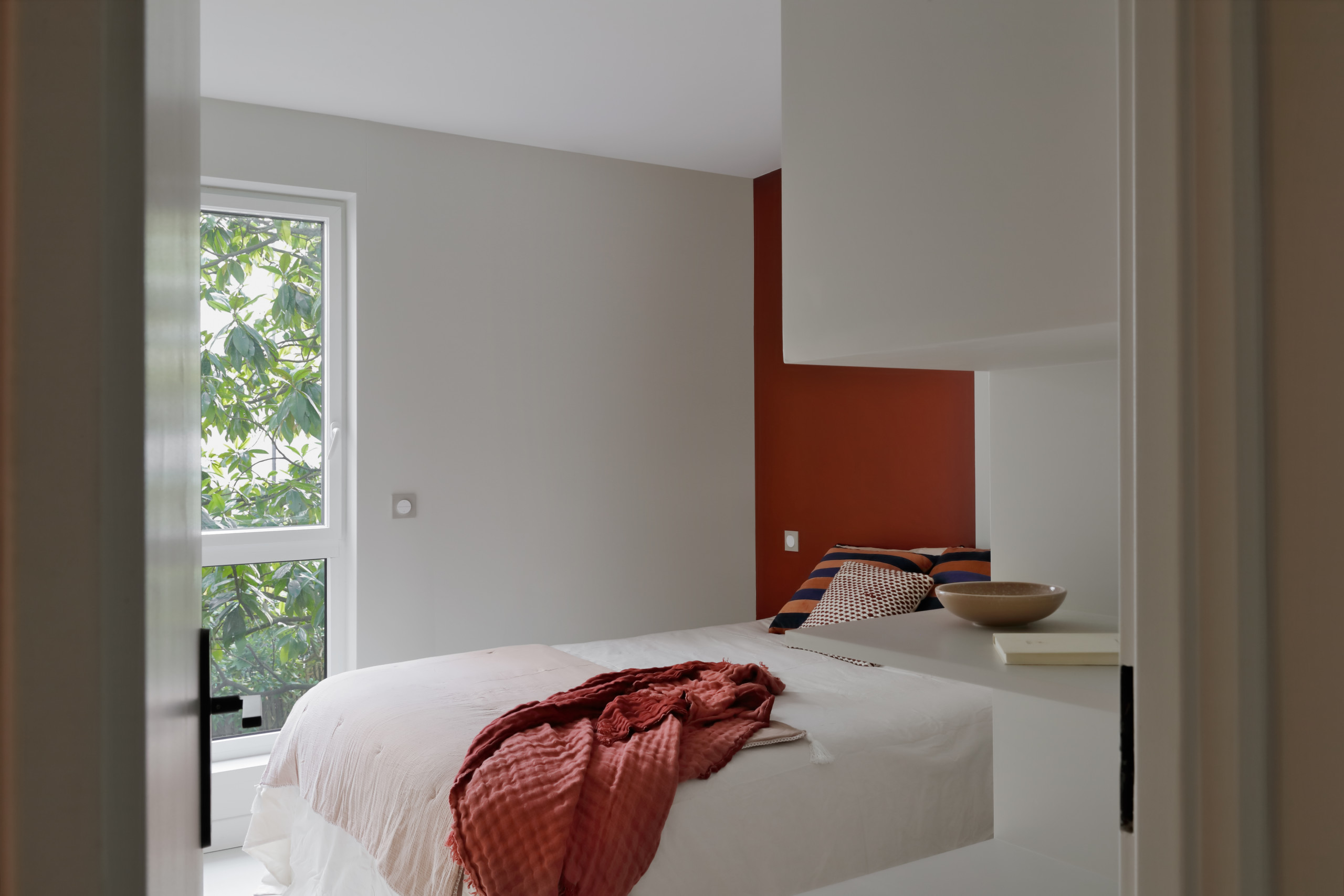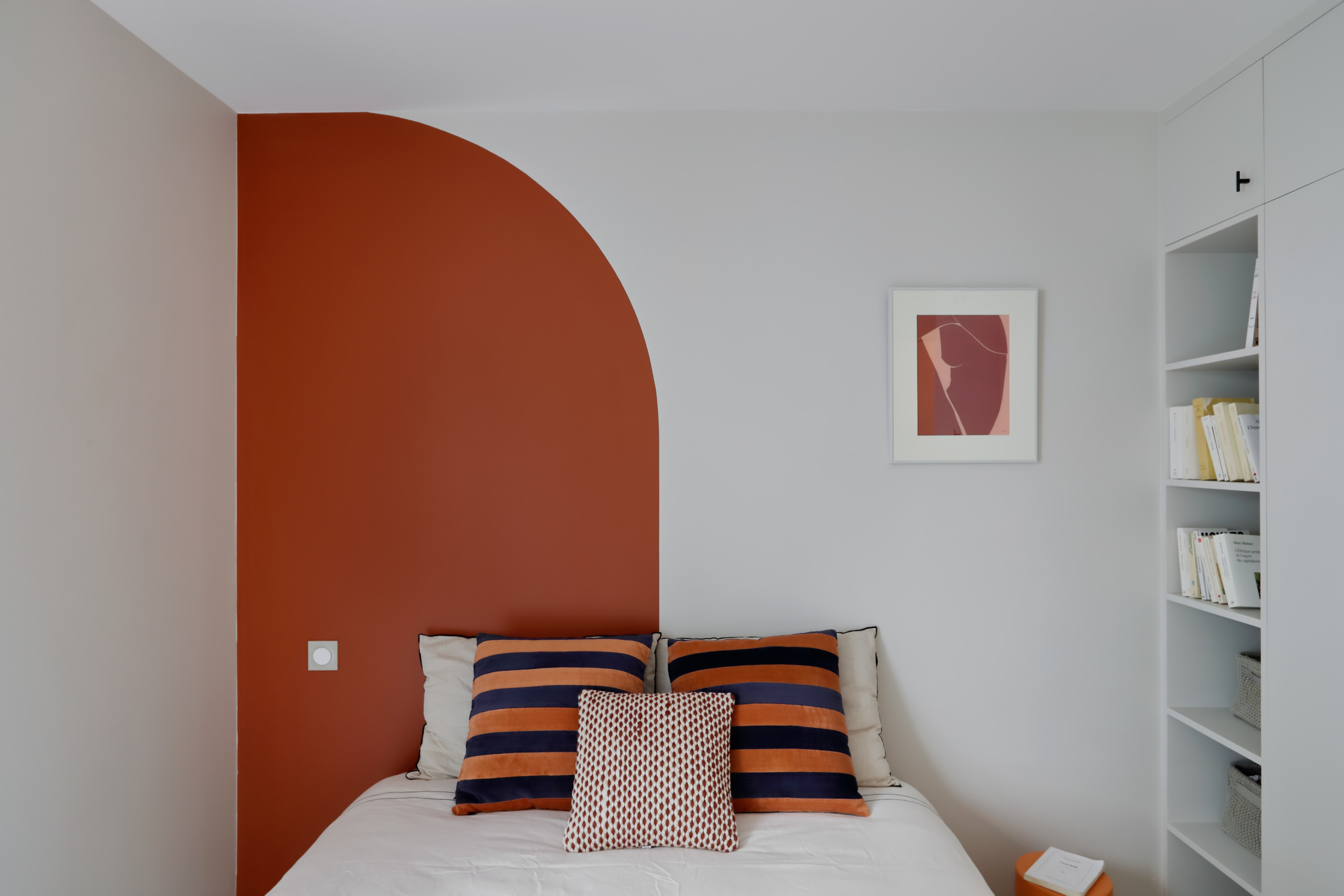 Quant à la tête de lit, elle reprend les courbes rose corail du passage vers le couloir.