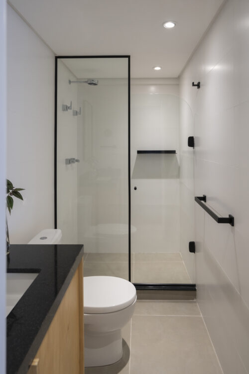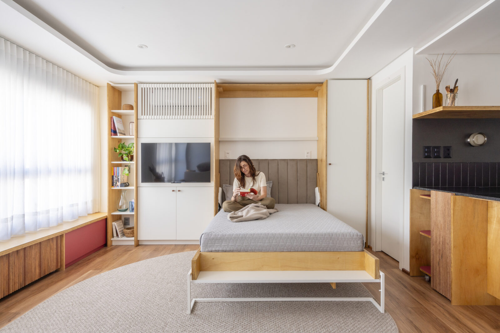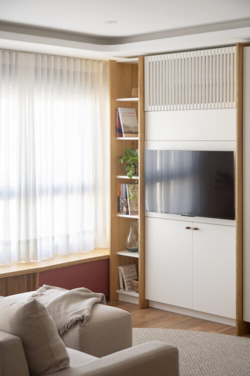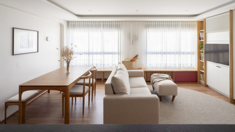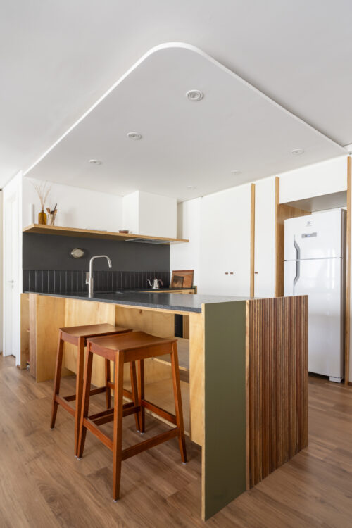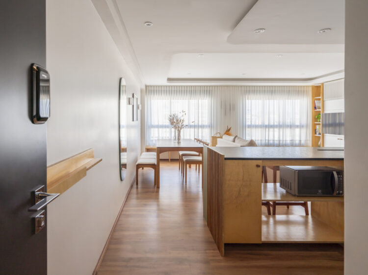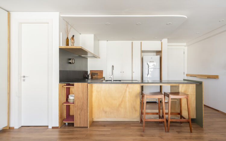 À Porto Alegre, au Brésil, ce studio de 42 mètres carrés prend place dans un ancien hôtel réhabilité. Dessiné dans un esprit minimal, il mise sur la continuité du mobilier pour agrandir l’espace et adoucir la lumière.