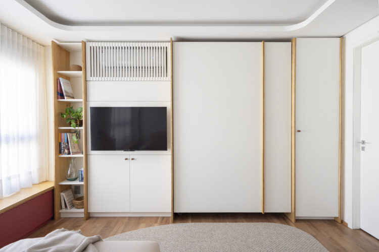 Les tons sable du tissu répondent au bois clair du mobilier sur mesure, qui intègre la télévision et la climatisation. L’ensemble, adouci par un grand tapis texturé, compose une atmosphère douce et enveloppante.