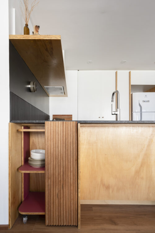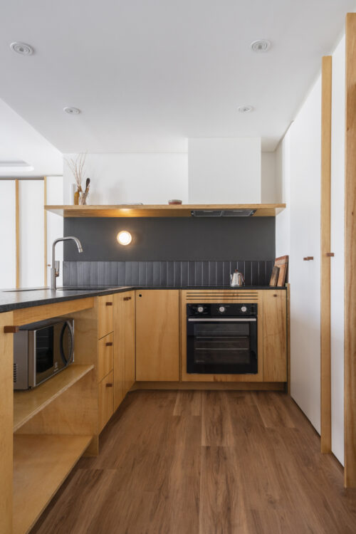 Les façades en contreplaqué marin révèlent la texture du bois, soutenues par le noir mat de la crédence.