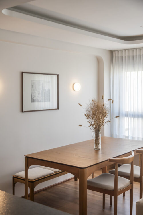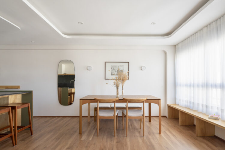 Le plafond, modelé par un jeu de courbes, accompagne la lumière et adoucit la géométrie de la pièce. La table en bois clair s’accorde au banc intégré qui longe le mur et souligne la vue.