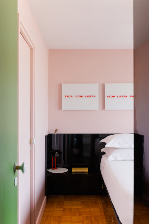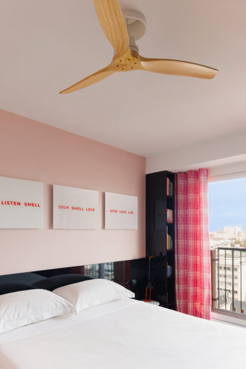 Une installation en Altuglas transparent de Thierry Peltrault, clin d’œil à Joseph Kosuth, prend place sur le mur face à la porte de la chambre. La tête de lit en stratifié noir brillant intègre deux tablettes, chacune supportant une lampe Bibibibi d’Ingo Maurer.