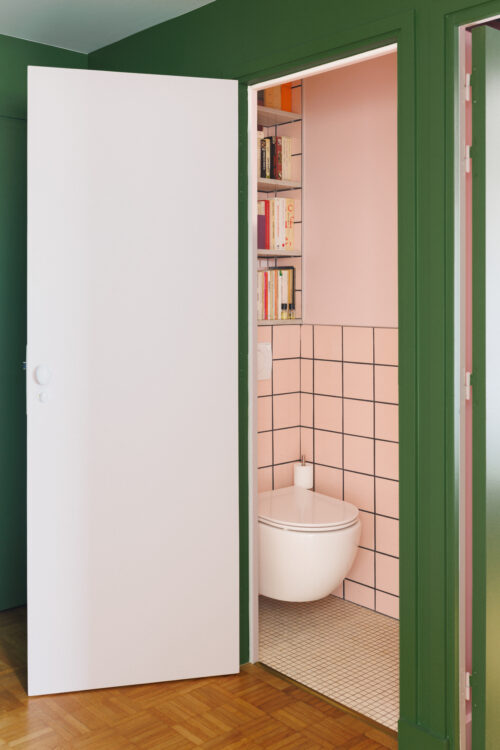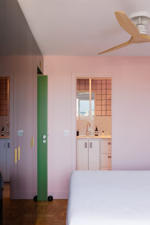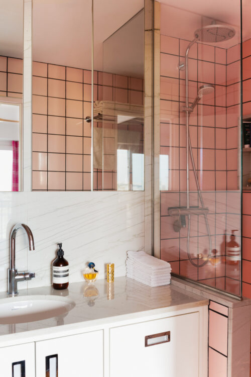 Entièrement revêtue de faïence rose aux joints noirs, la salle d’eau joue la carte de l’esthétique graphique. Elle intègre une grande douche et un meuble vasque avec tiroirs et placards, tandis qu’un miroir posé sur la crédence en granite mont Blanc reflète la ville.