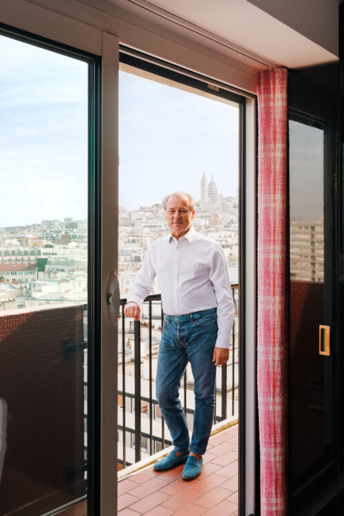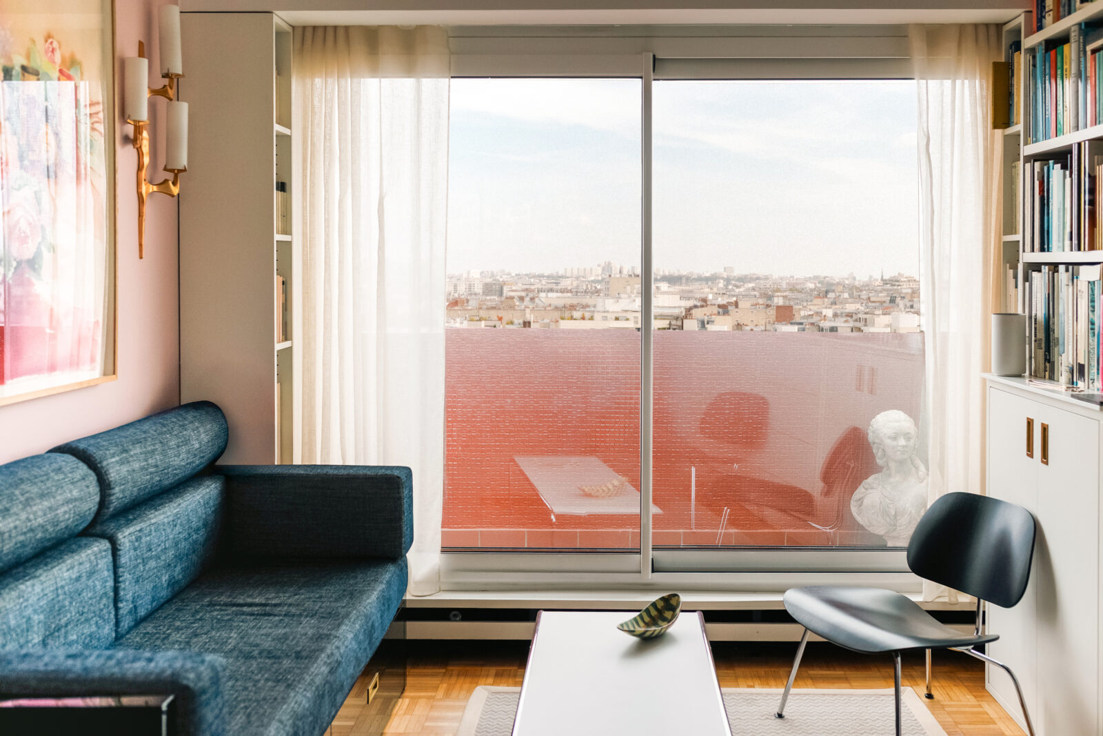 Toutes les pièces de l’appartement s’ouvrent sur une terrasse filante qui surplombe Paris. C’est cette vue qui a guidé Thierry Peltrault dans le dessin du plan, le choix des matériaux et des couleurs.
