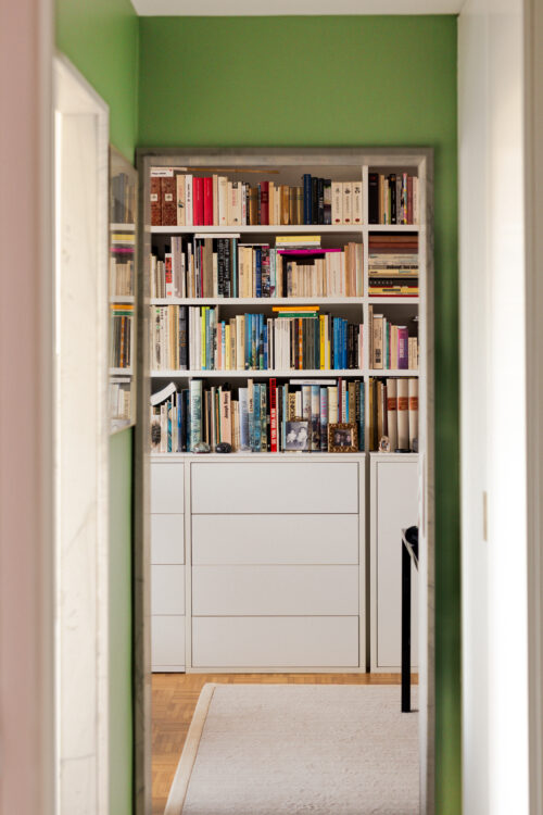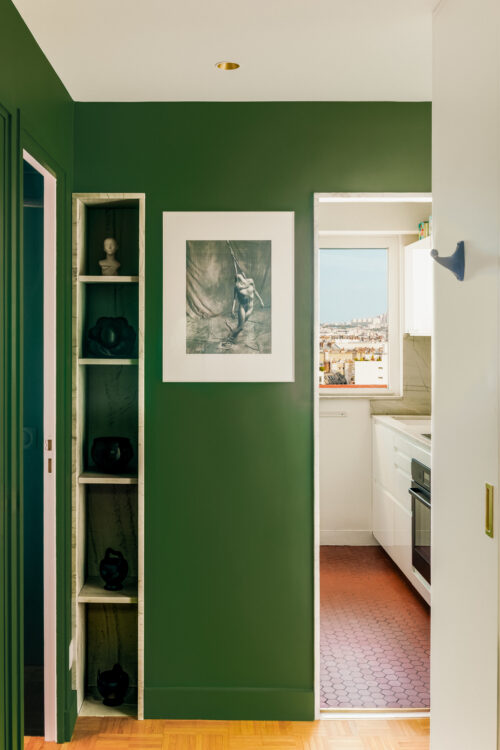Dans l’appartement d’origine, l’entrée formait un espace encombré et sans cohérence. Thierry Peltrault en fait aujourd’hui un point d’équilibre : un volume resserré et peint d’un vert olive qui cadre la perspective sur la cuisine blanche. Une niche redécouverte pendant les travaux y apporte une touche d’intimité, entre fonctionnalité et émotion.