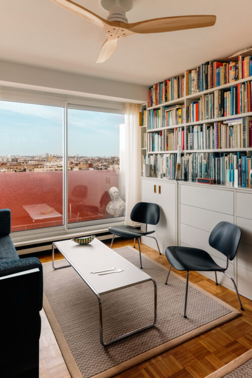 À l’instar de la cuisine, le salon s’organise en lignes parallèles, guidant le regard vers la terrasse et le Sacré-Cœur. Fauteuils LCM de Charles et Ray Eames, table basse Laccio de Marcel Breuer, canapé sur mesure de Thierry Peltrault. Le contraste graphique entre tubulures en inox poli et surfaces noires ou blanches structure la composition.