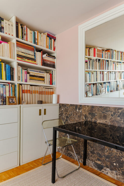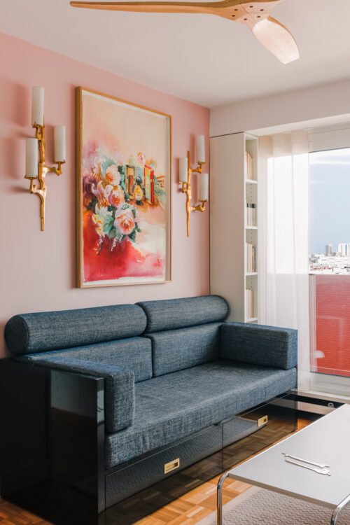 Derrière le canapé, un mur rose met en scène une aquarelle colorée de Michel Charrier. L’œuvre est soulignée par des appliques années 1960 en bronze doré et verre opalin de chez Arlus, tandis que des rangements discrets sous le canapé prolongent la fonctionnalité de l’espace sans altérer la composition graphique.