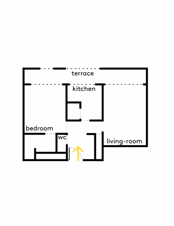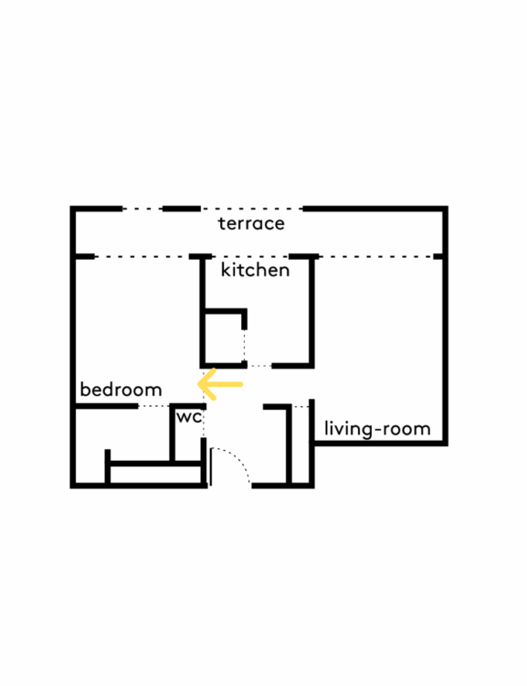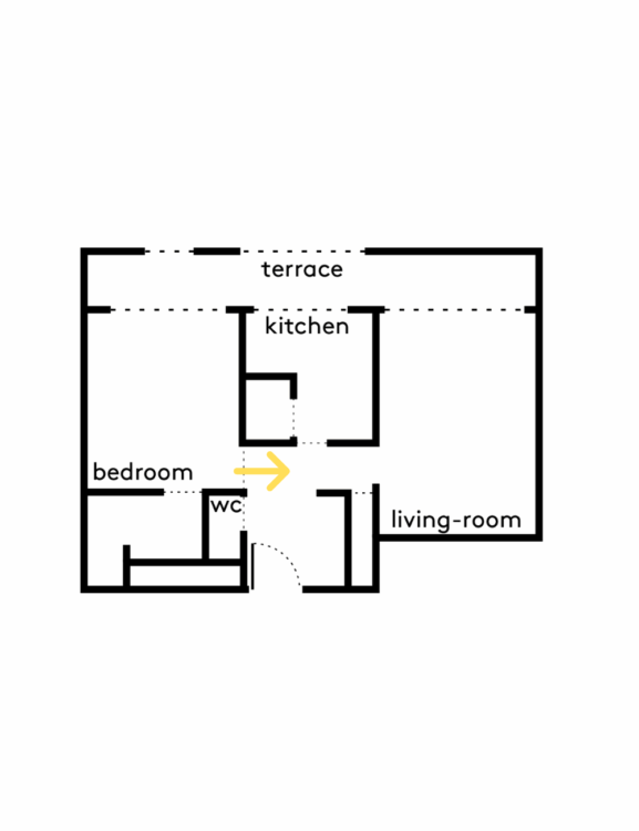 Chaque passage de l’appartement est pensé pour cadrer des vues savamment choisies. Depuis l’entrée, l’axe vers la cuisine s’ouvre sur la ville, tandis que la circulation entre la chambre et le salon crée une perspective fluide et dégagée.
