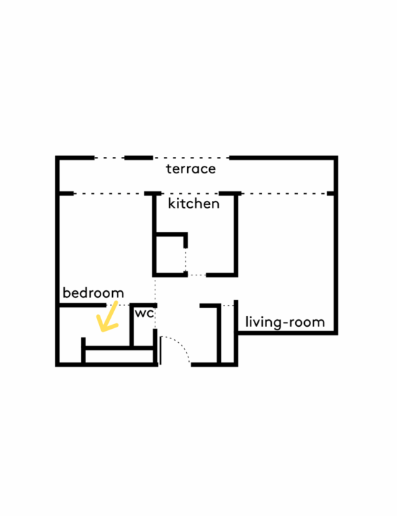 Le lit-podium avec tiroirs fait face à une penderie en stratifié noir brillant, qui reflète le panorama de la ville et prolonge la perspective. L’accès à la salle d’eau se fait depuis la chambre.
