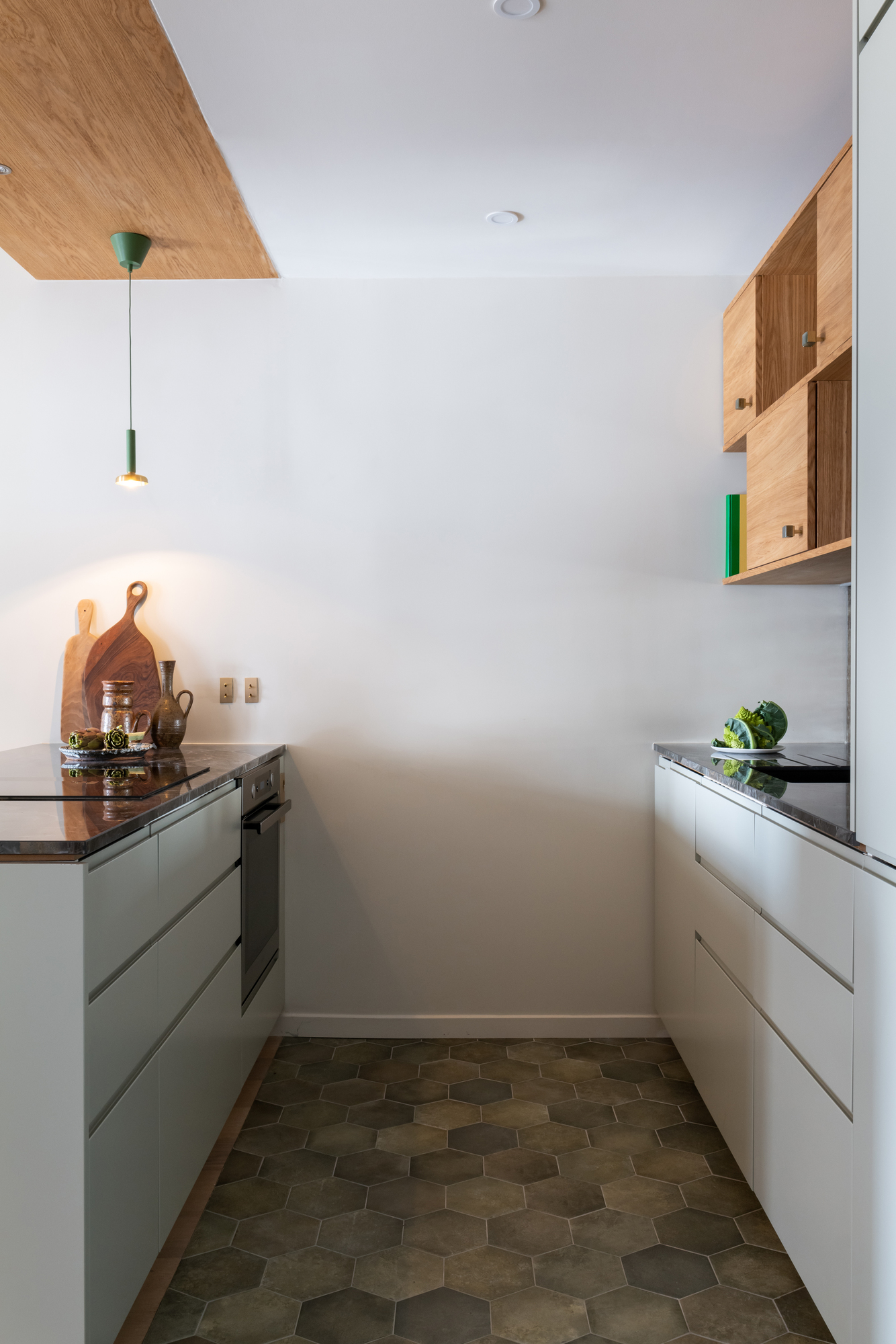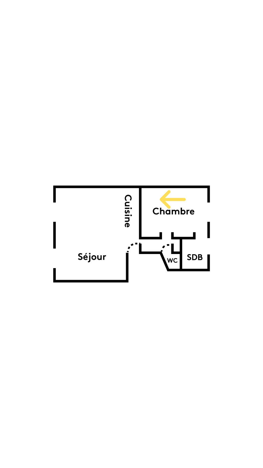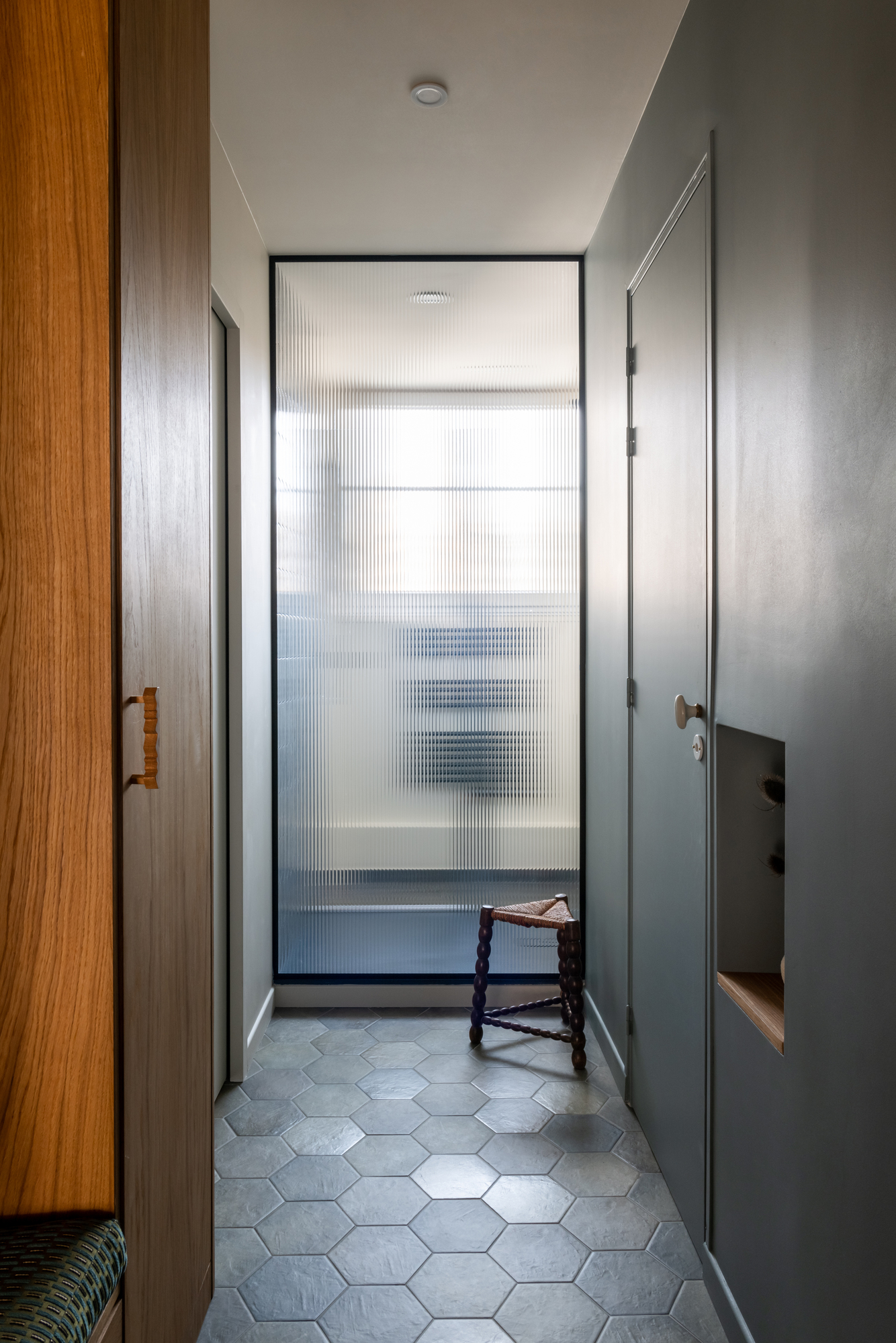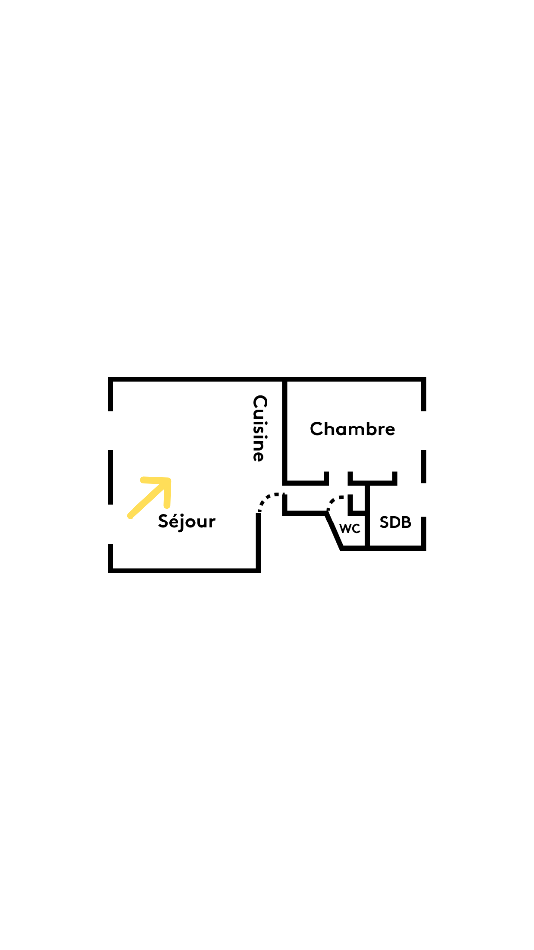L’entrée débouche sur la cuisine, intervertie avec l’ancienne salle d’eau pour s’ouvrir sur le séjour.