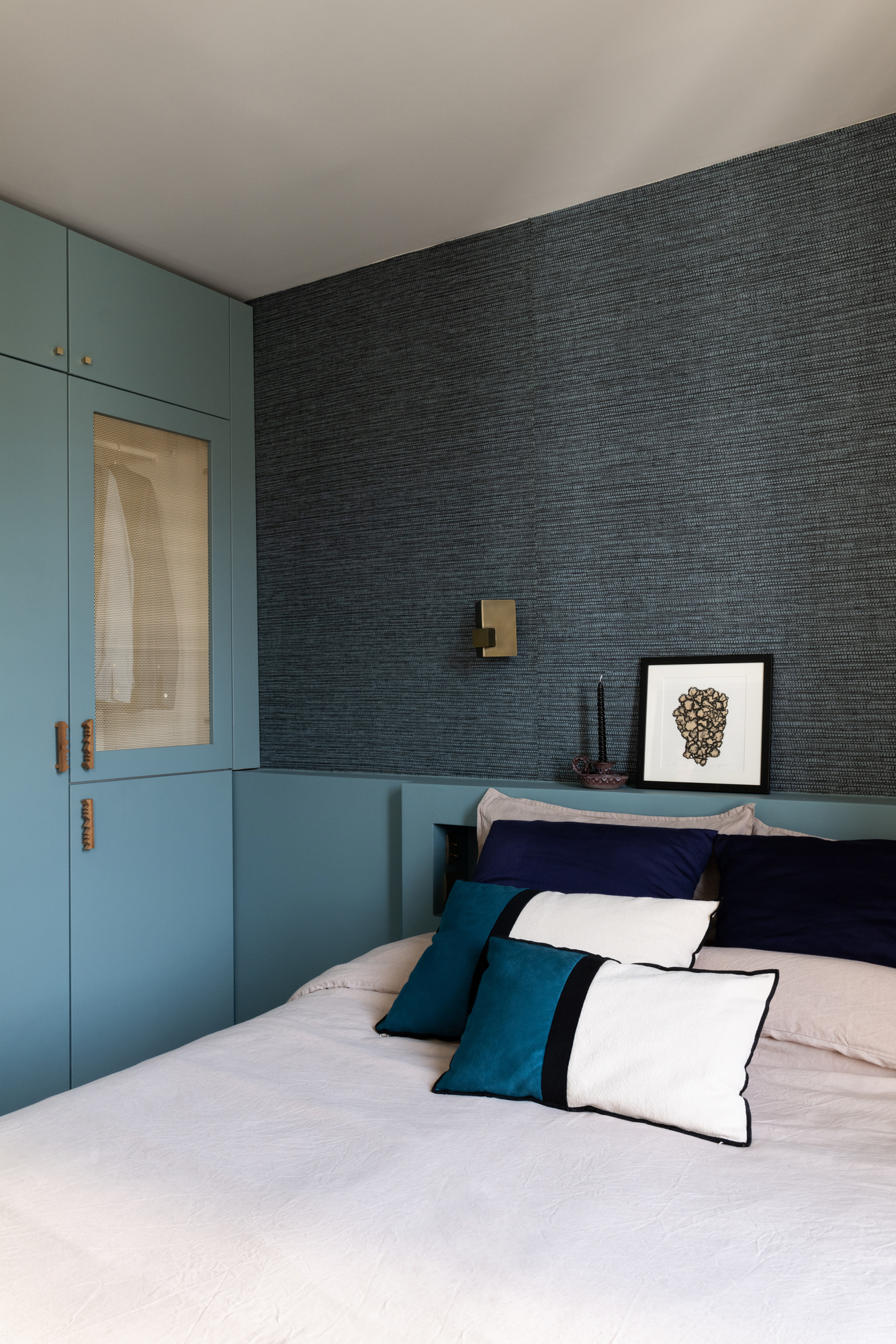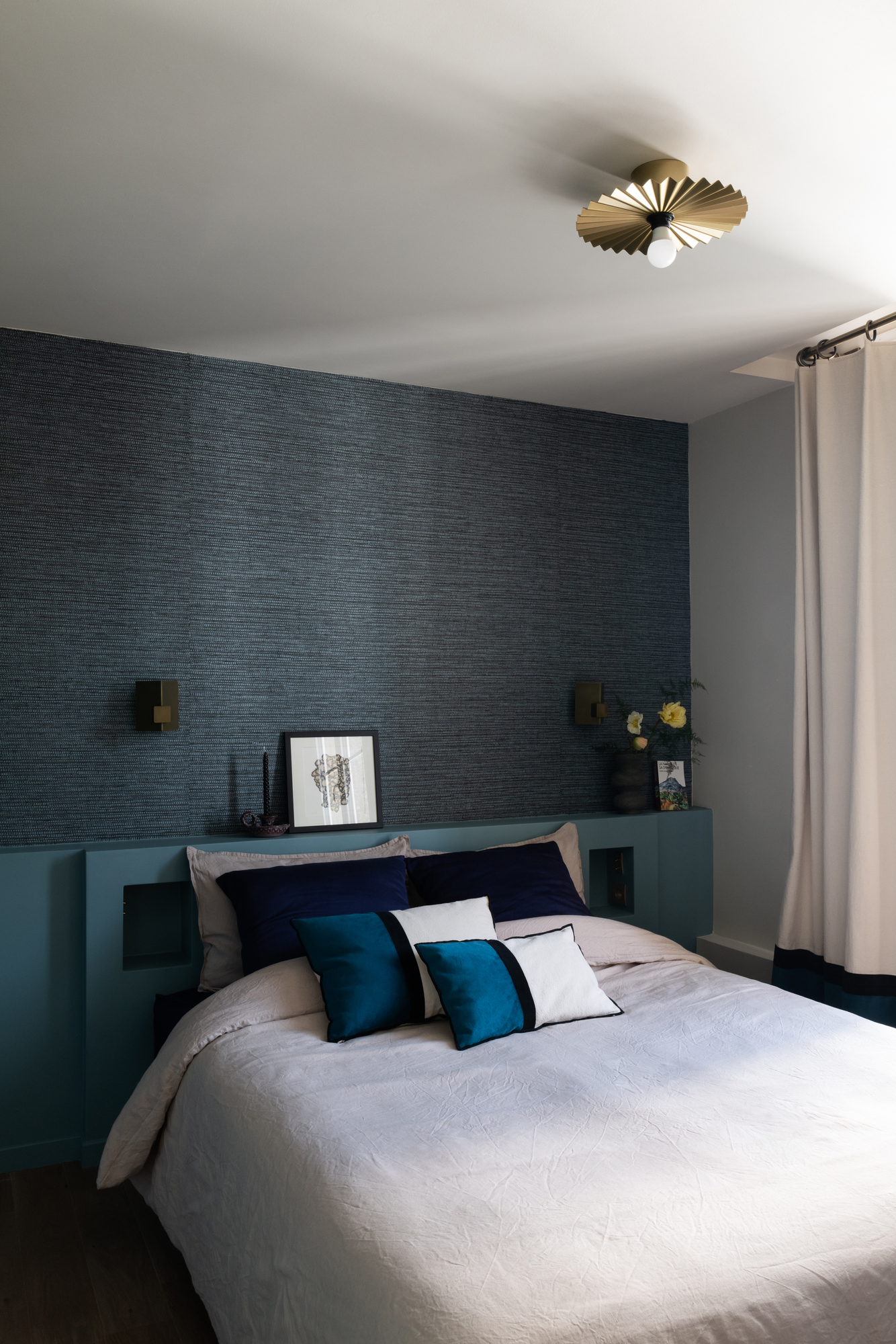 La chambre fait toujours la part belle aux matériaux naturels, avec un papier peint en raphia Arte et une parure de lit en lin.