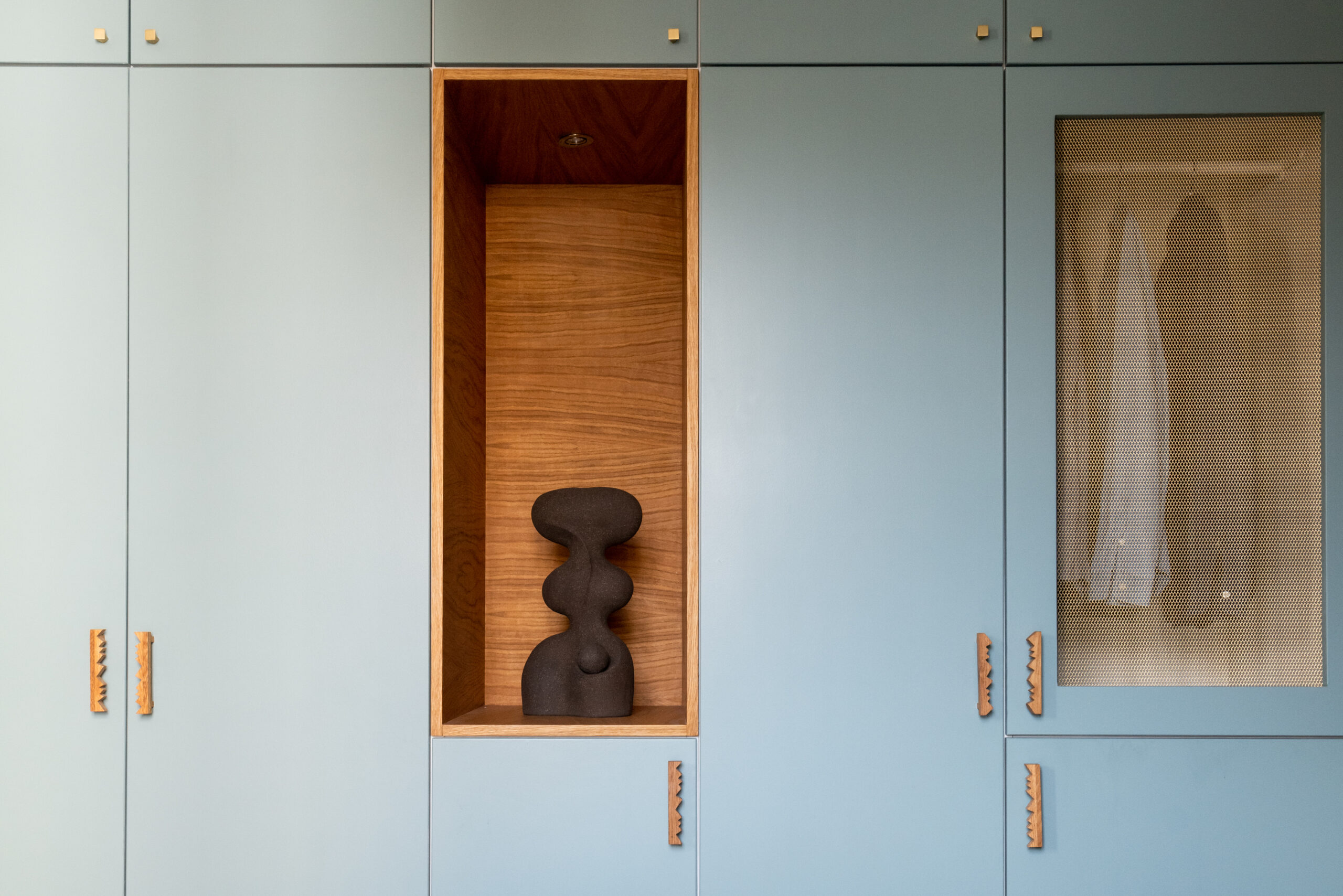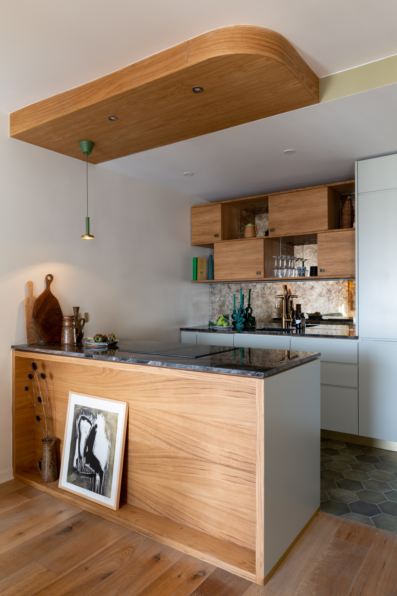 La crédence de la cuisine en miroir vieilli donne de la profondeur à la pièce et évoquerait presque le reflet d’un lac, tandis que le chêne se fait omniprésent.