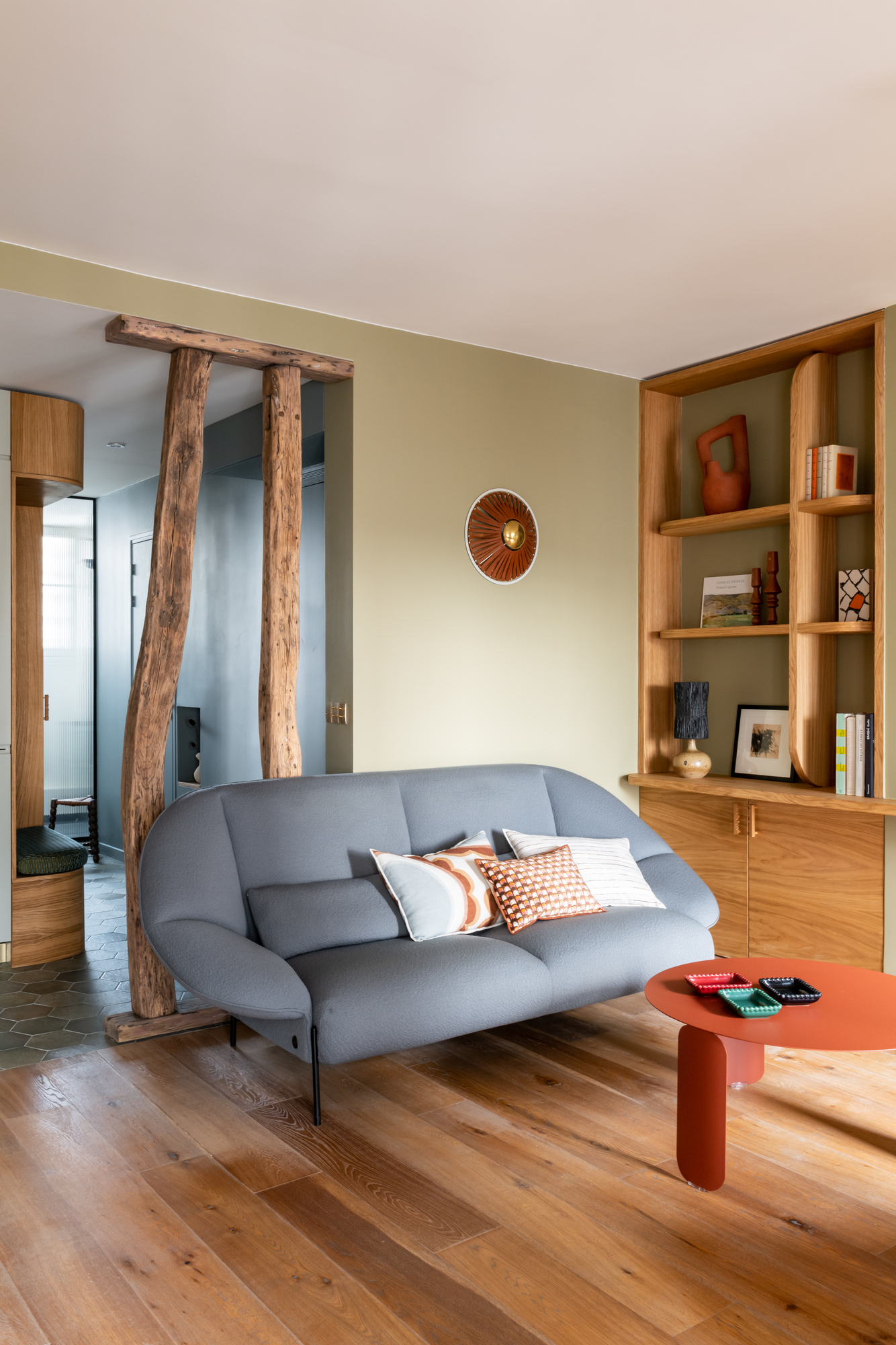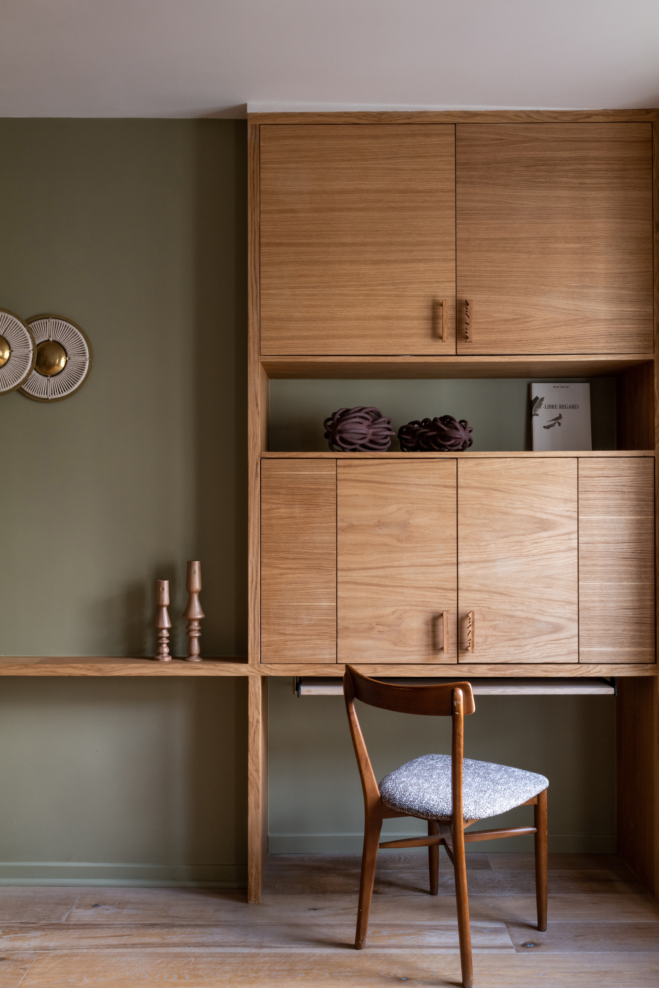 Côté salon, de la menuiserie sur mesure habille le mur pour accueillir du rangement et… un bureau d’appoint, propice au télétravail.