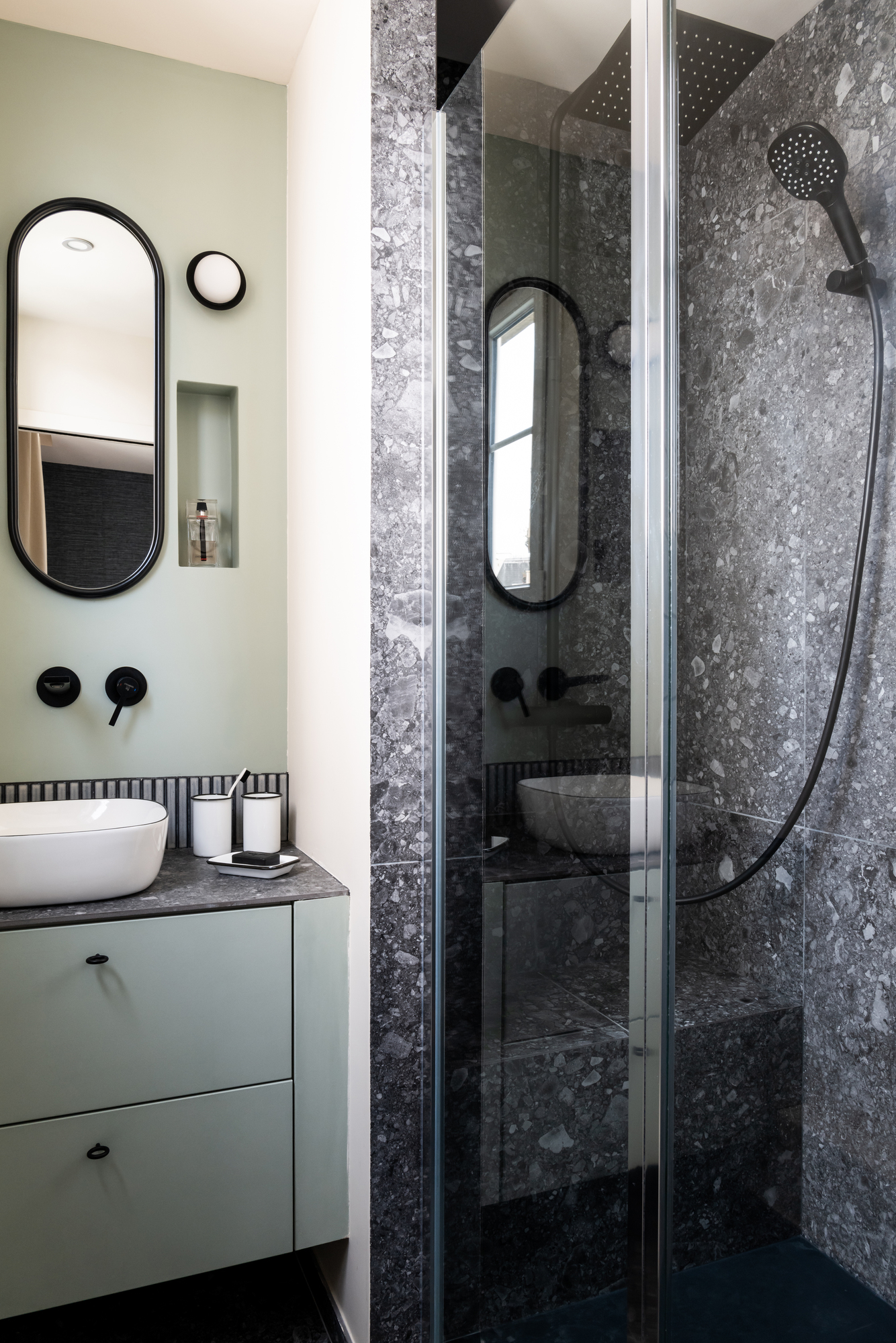 On retrouve dans la salle d’eau le vert du séjour, issu d’une peinture Argile biosourcée, ainsi qu’un carrelage CasaLux conférant un aspect minéral à la pièce.