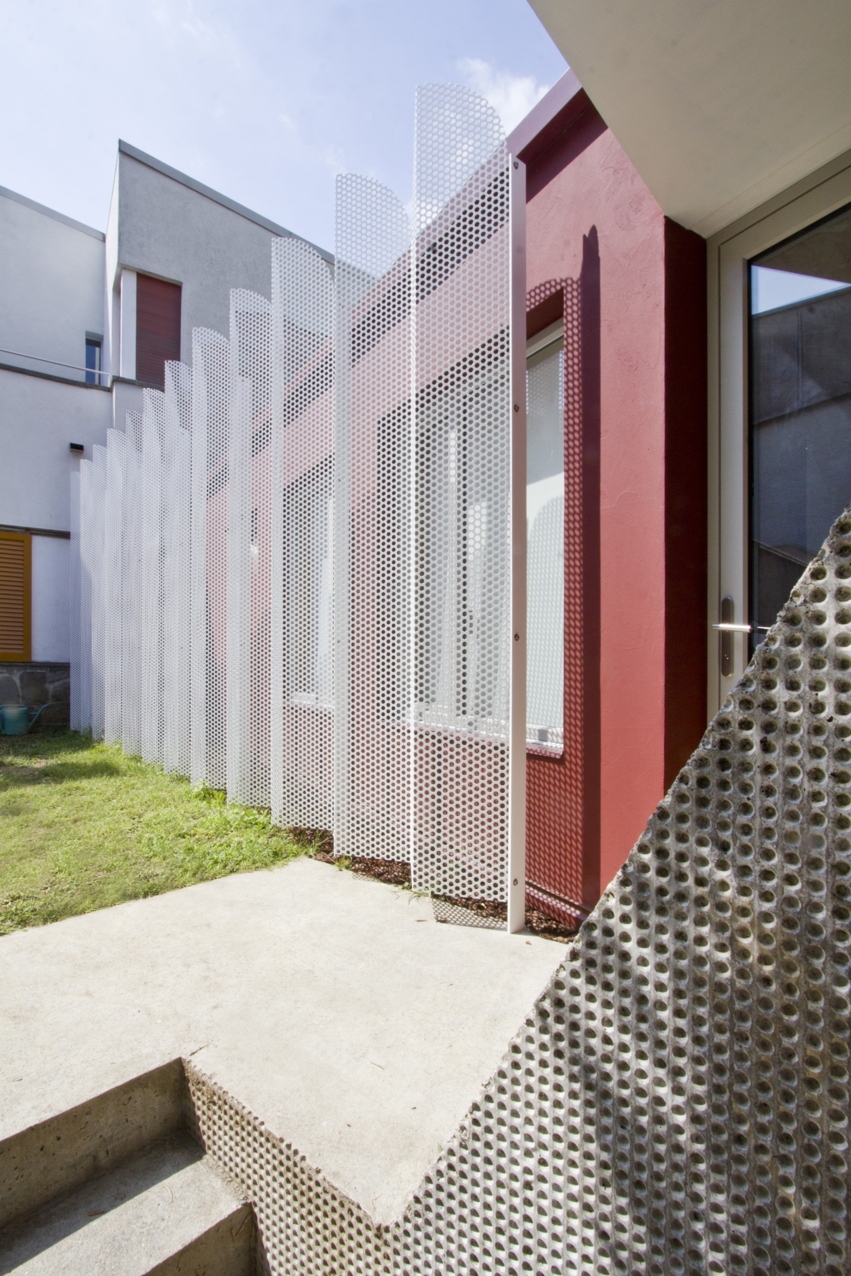Vu de l’extérieur, la structure de cet ancien porche est restée intacte. Ses ouvertures ont été transformées en baies, habillées d’une claustra en métal déployé.