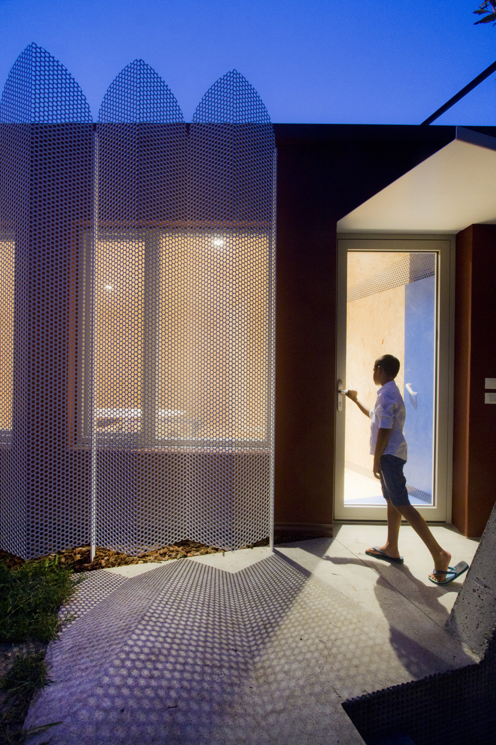Au crépuscule, la claustra joue le rôle de voilage, version ultra contemporaine. Allez, on entre !