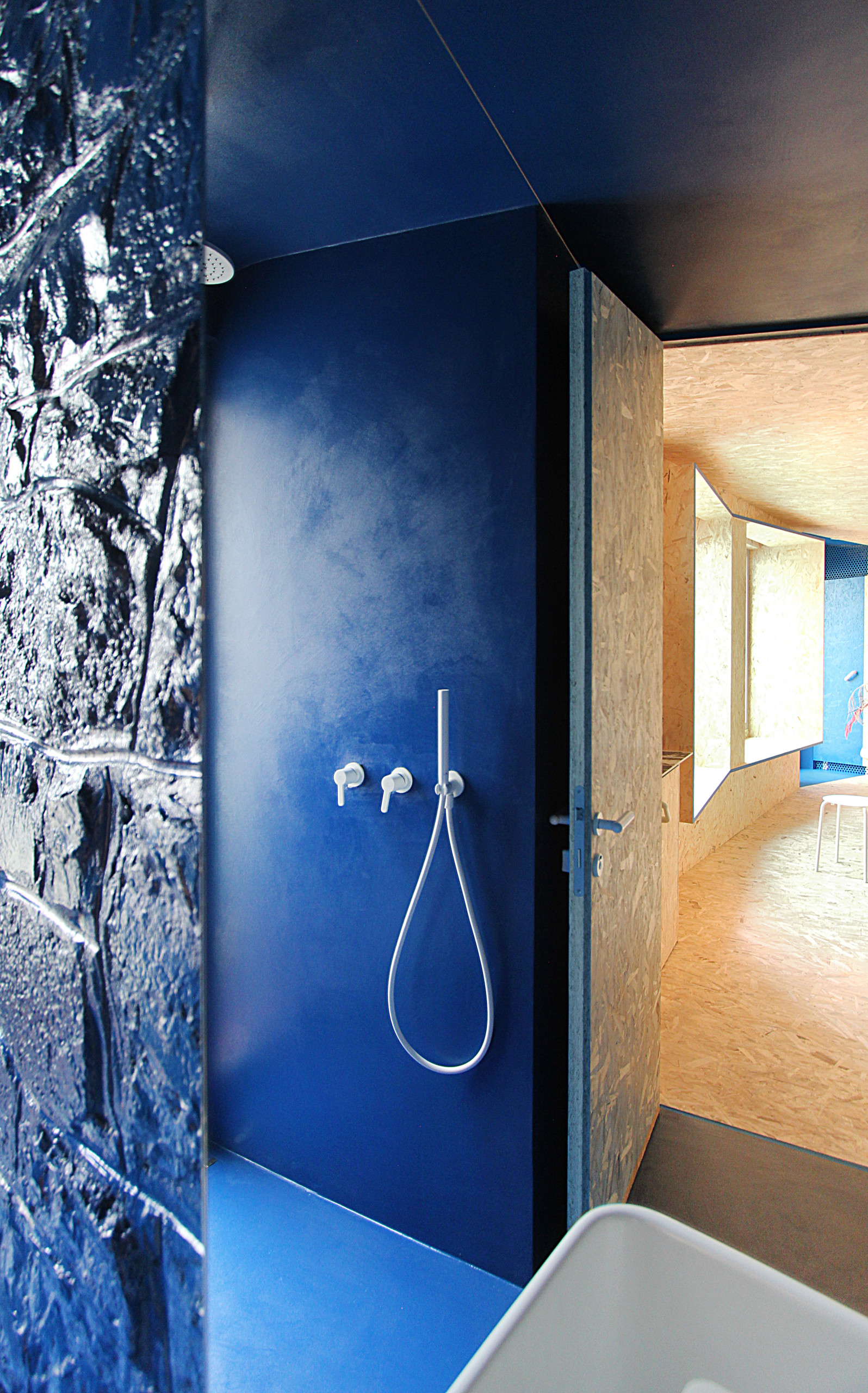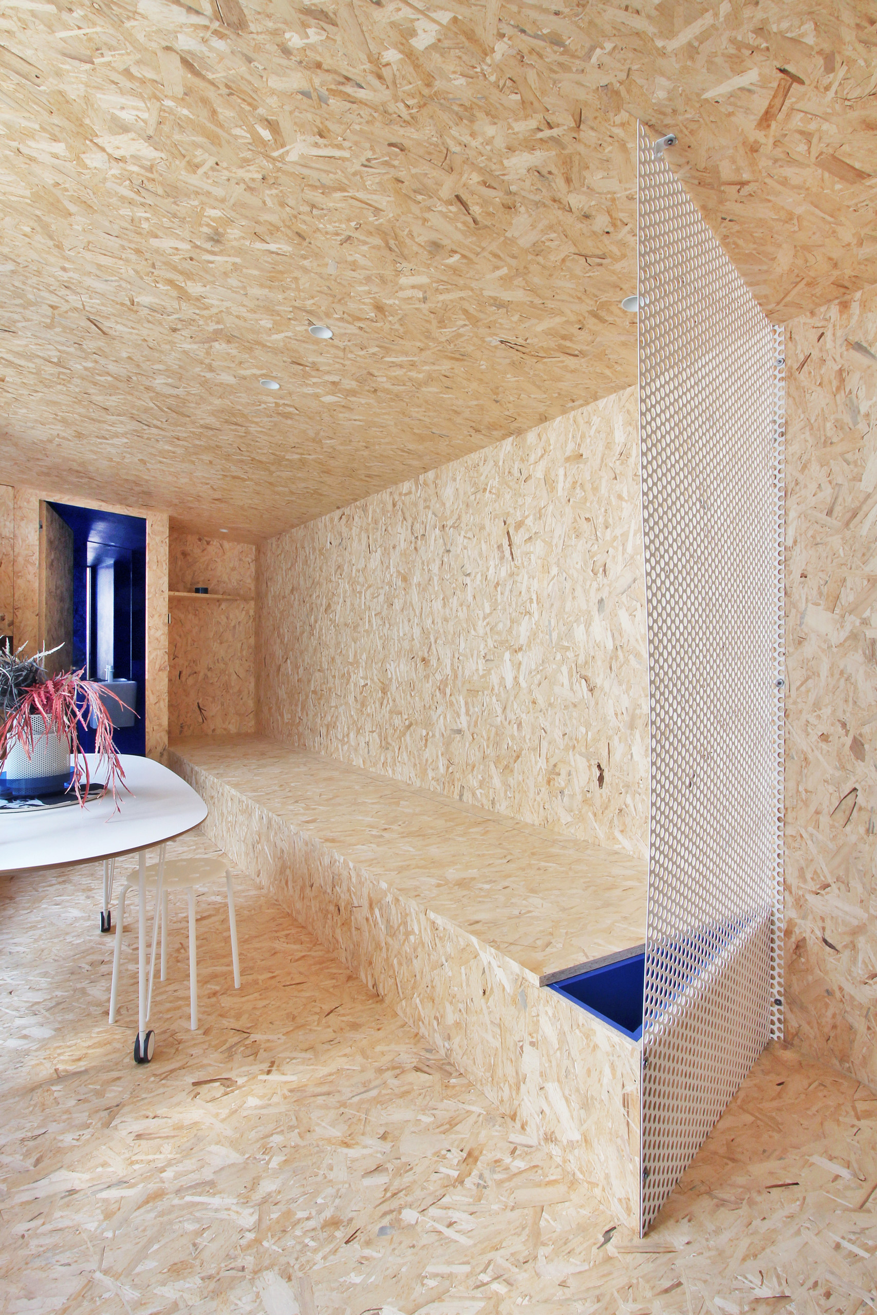 L’entrée se fait directement dans la pièce à vivre, tapissée d’OSB du sol au plafond. Une banquette a été créée sur toute la longueur de la pièce. Le soir, on y déroule des matelas pour dormir.