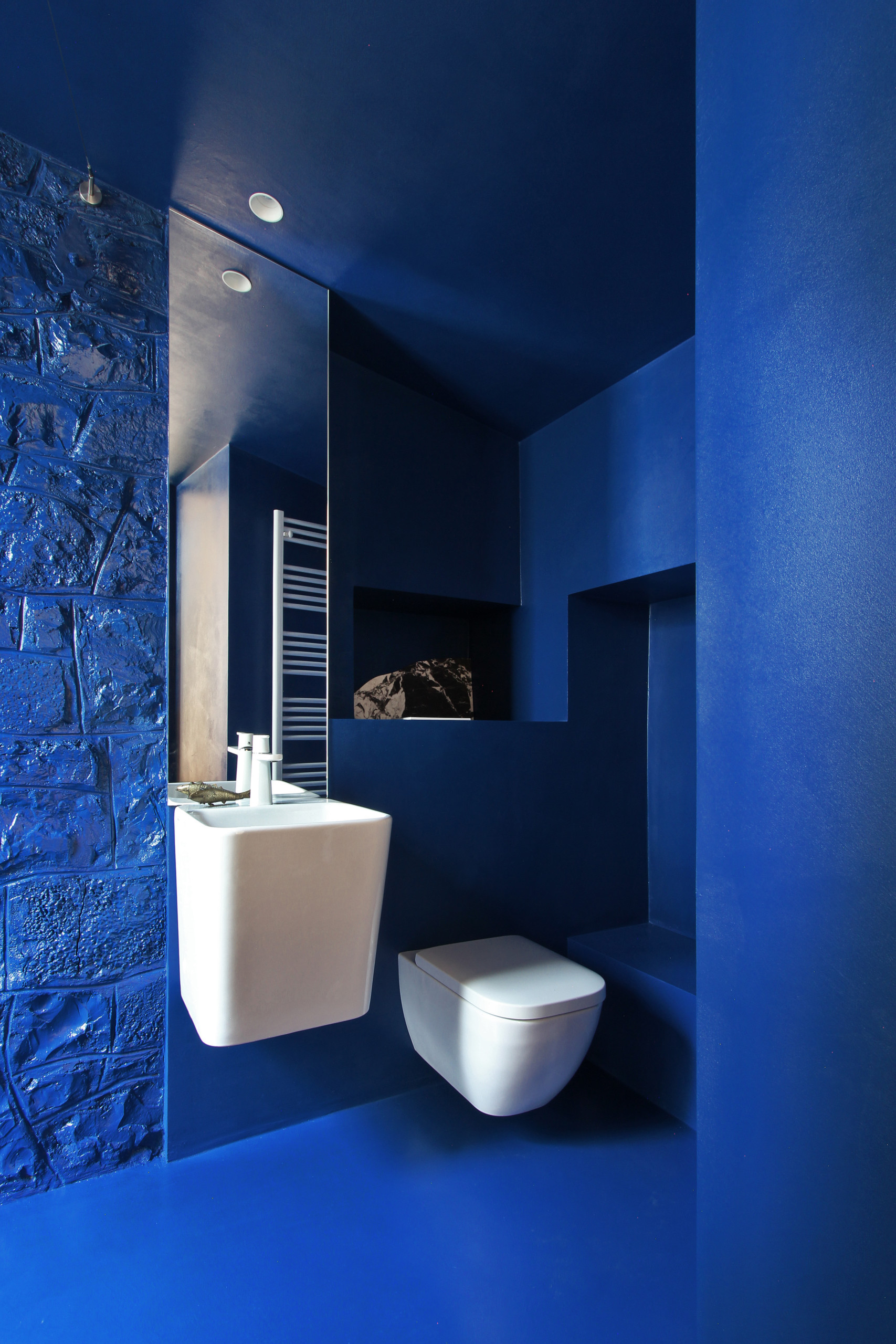 Côté vasque, le mur d’origine en pierres a été conservé et peint. En face, un mur a été monté pour accueillir la douche à l’italienne… Nous sommes à Bergame après tout !