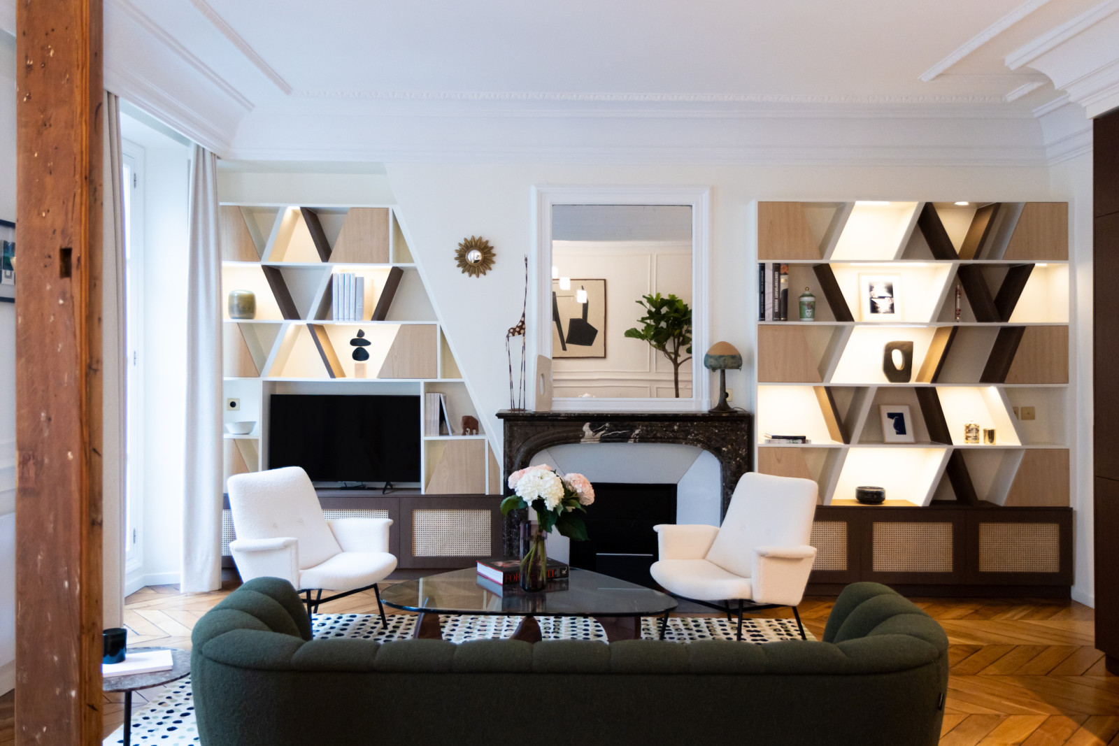 La bibliothèque contourne les contraintes de la cheminée et de son conduit pour s’intégrer naturellement dans le décor en jouant sur les obliques.