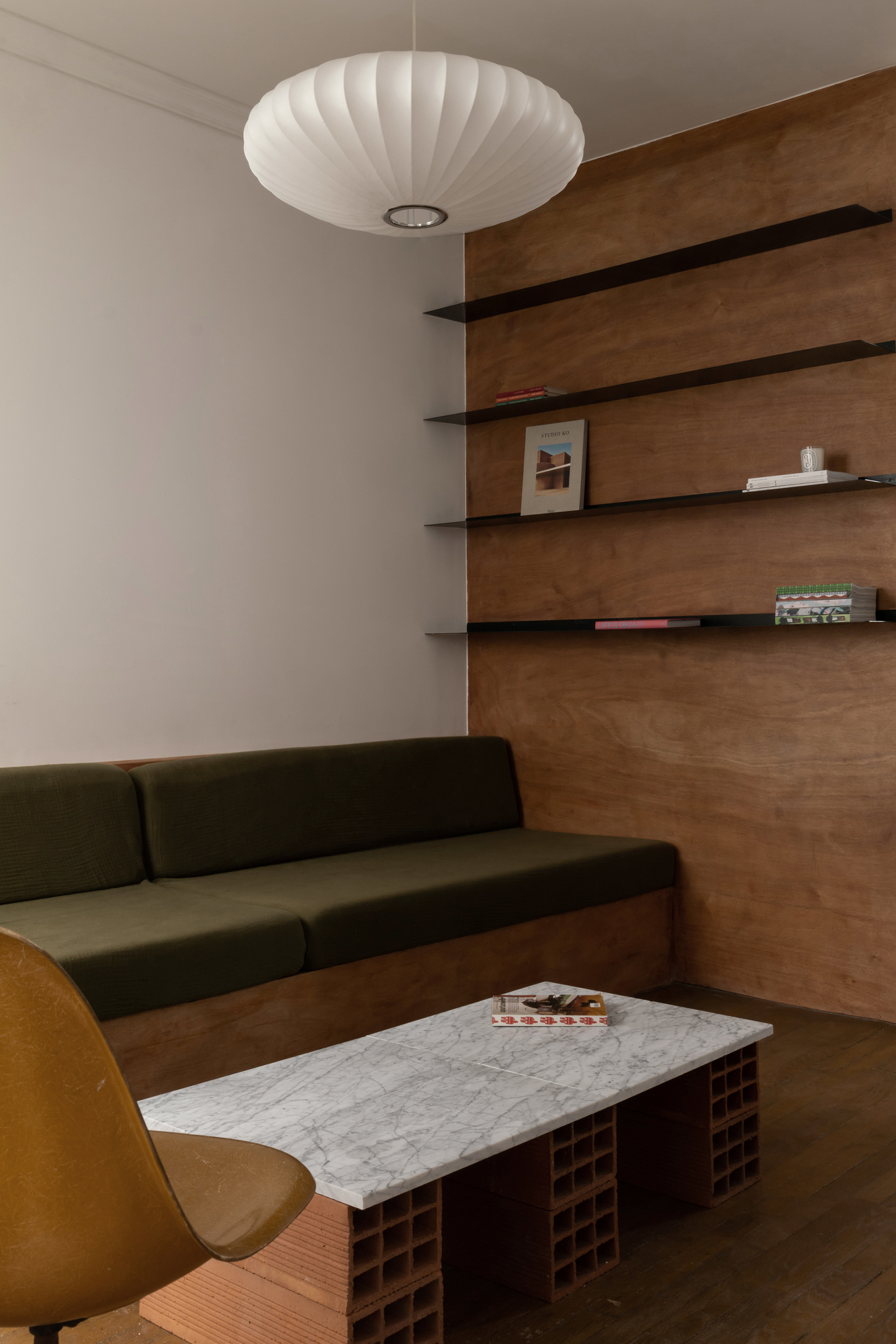 La table basse, en parpaing de briques et planche de marbre, est une création de l’architecte. Le canapé a été dessiné et conçu sur mesure en bois d’Okoumé. Un tapissier a réalisé les assises et les dossiers.