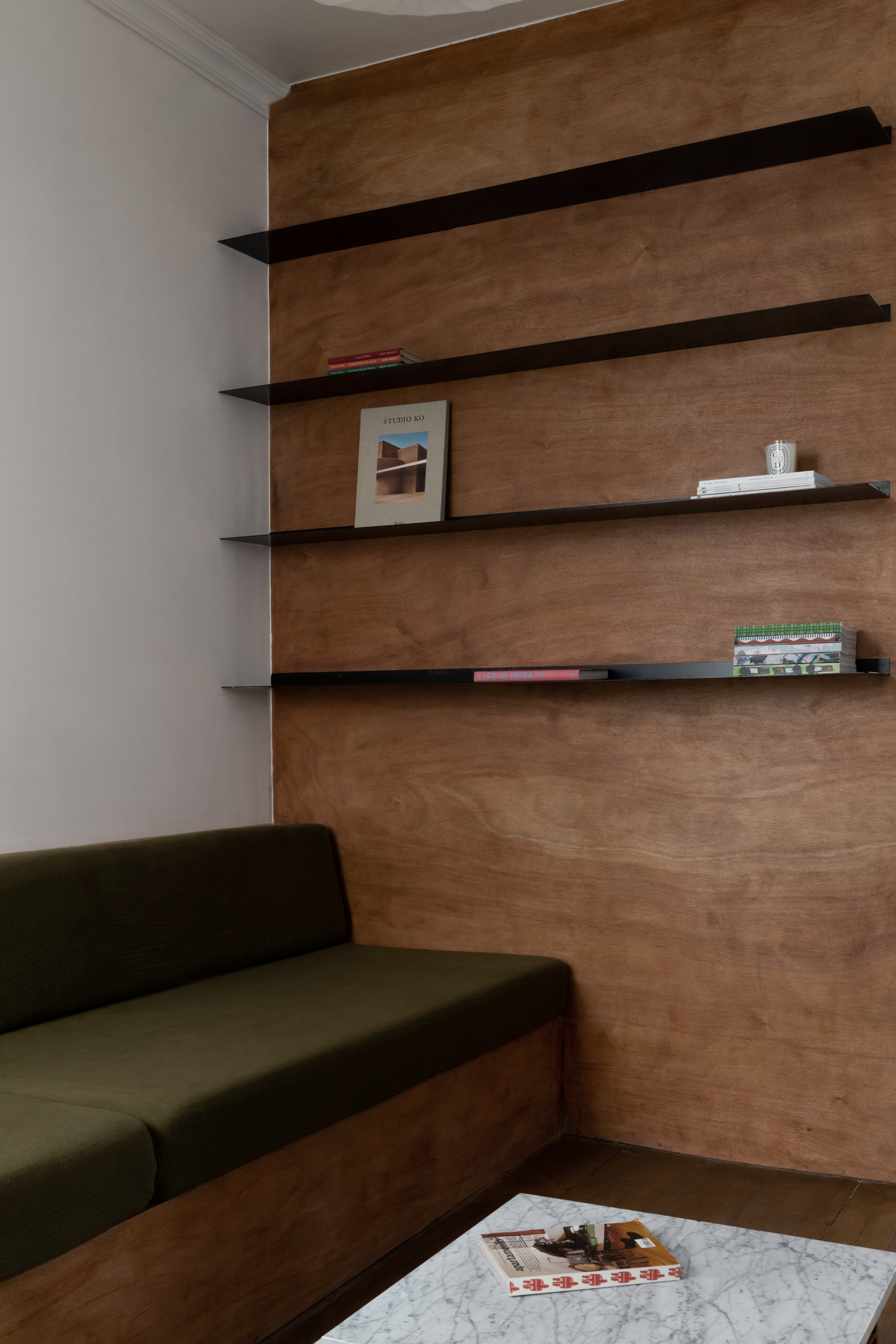Ce bois est très présent dans l’appartement, dans diverses mises en œuvre, comme ici pour l’habillage d’un pan de mur. L’association avec le métal des étagères est un des éléments fédérateurs de la décoration.