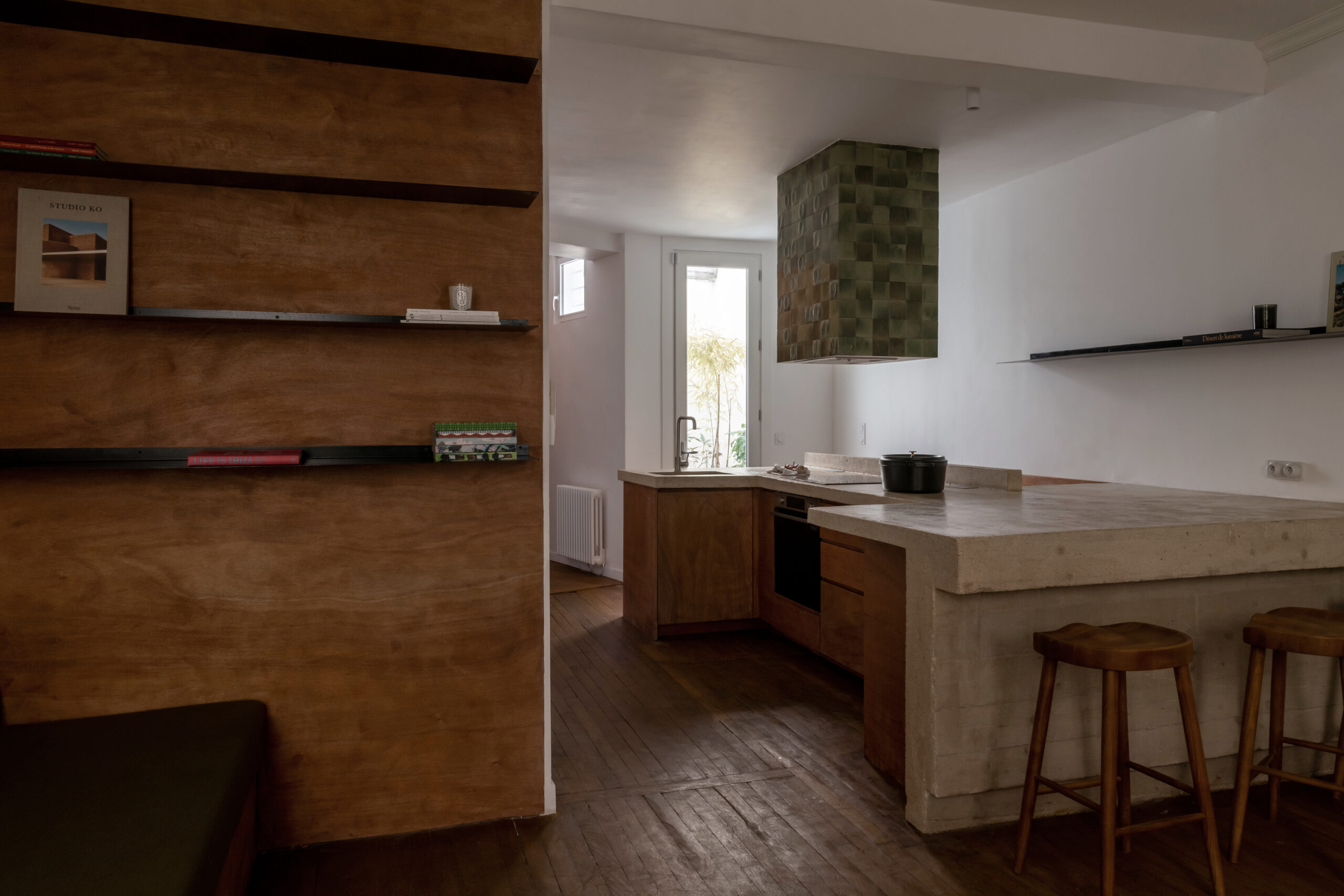 Le bois d’Okoumé s’invite aussi dans la cuisine, pour les façades basses de placard. Les éléments les plus techniques ont été réalisés en atelier, mais certaines pièces ont été travaillées sur place par un menuisier.