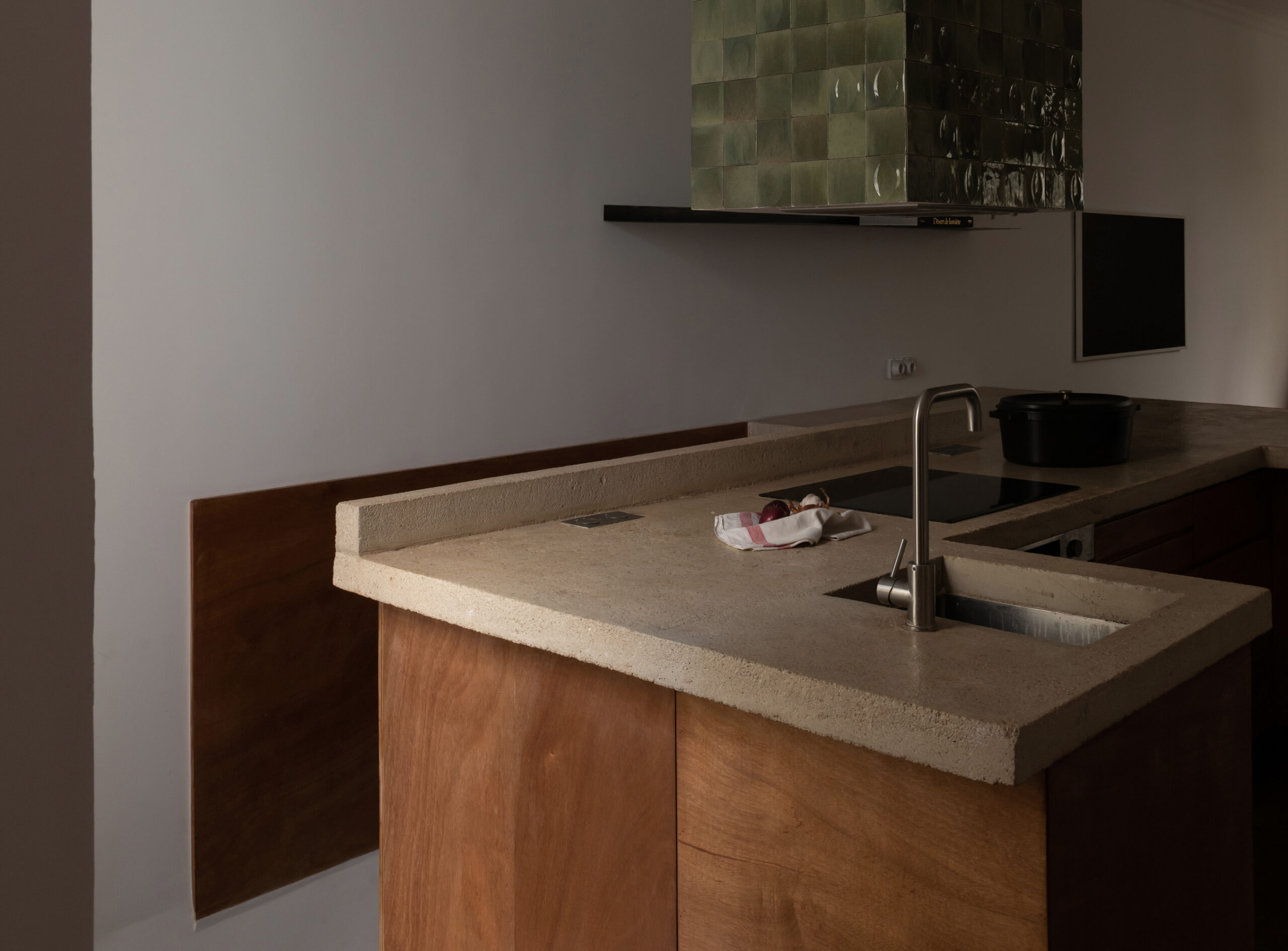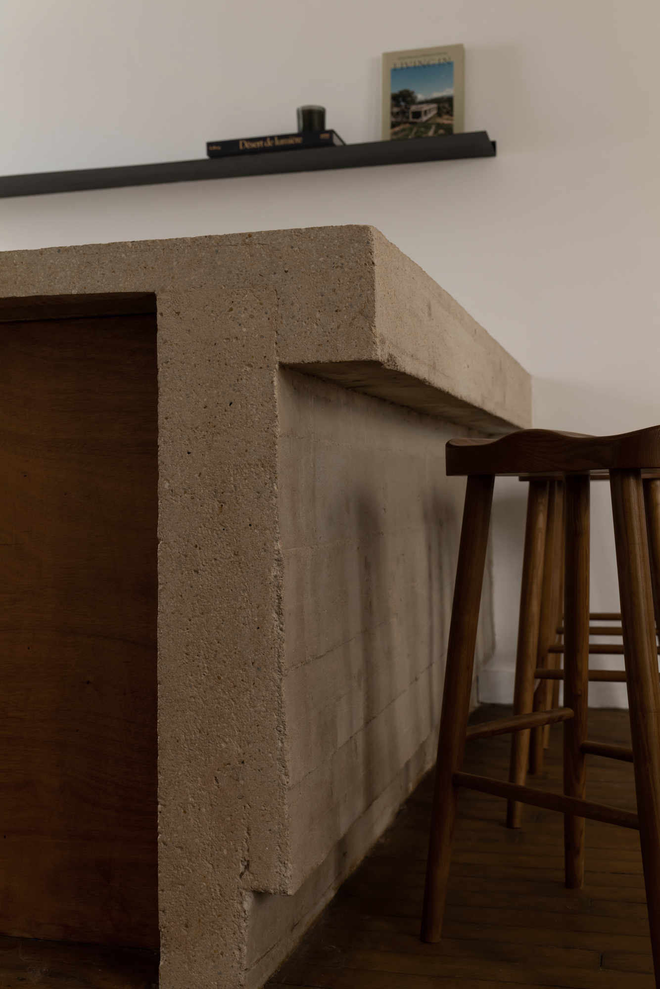 Le béton est un autre matériau brut qui fait office de fil conducteur. Dans la cuisine, il donne vie à un îlot brutaliste, dessiné tel une sculpture. Il sert tout aussi bien de plan de travail que de table à manger jusqu’à six convives.