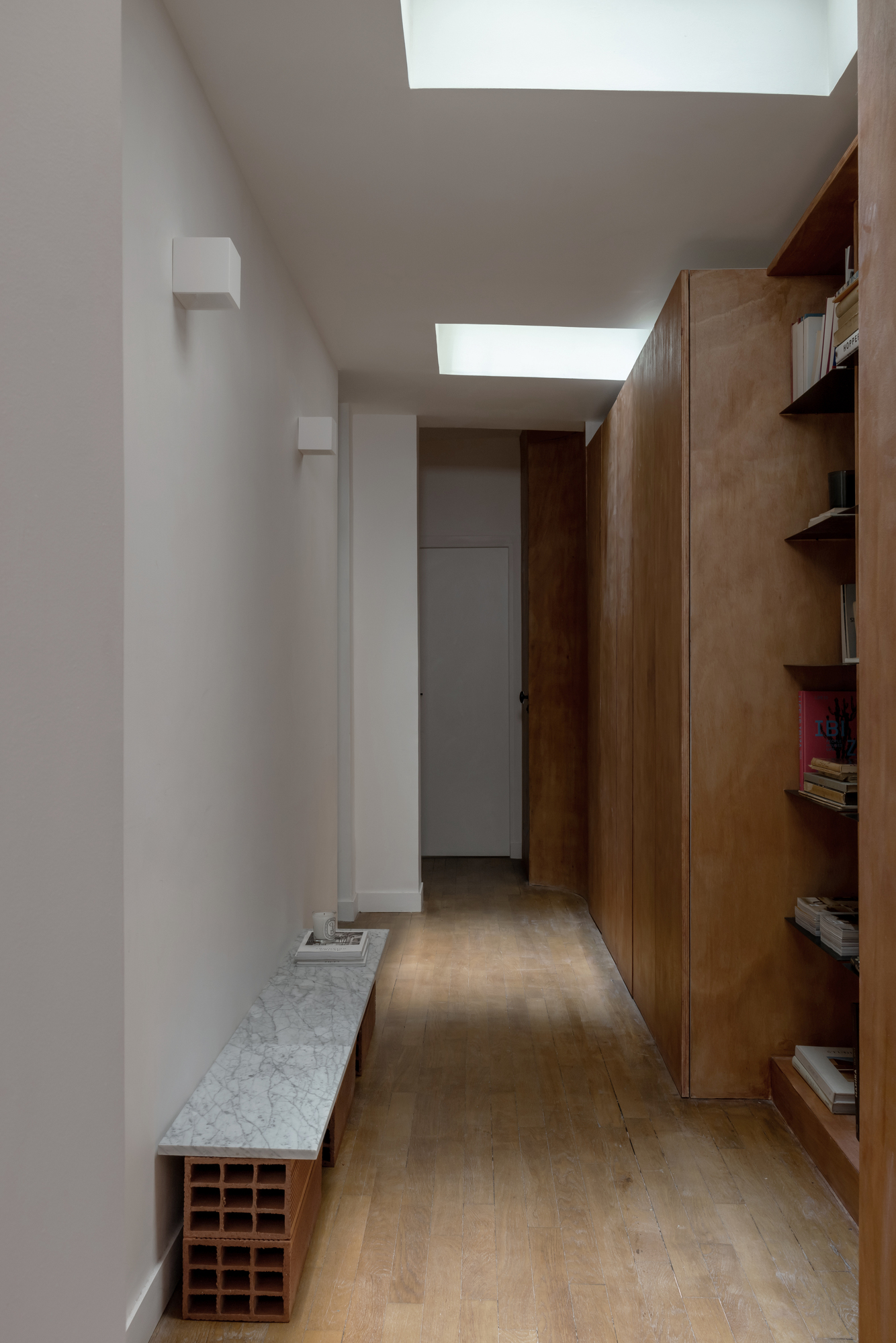 Ce grand couloir est le point de rencontre entre les deux anciens appartements. Il est très optimisé en termes de rangements et intègre tous les matériaux clés déjà rencontrés. Des fenêtres de toit ont été installées afin de profiter de la lumière naturelle zénithale.