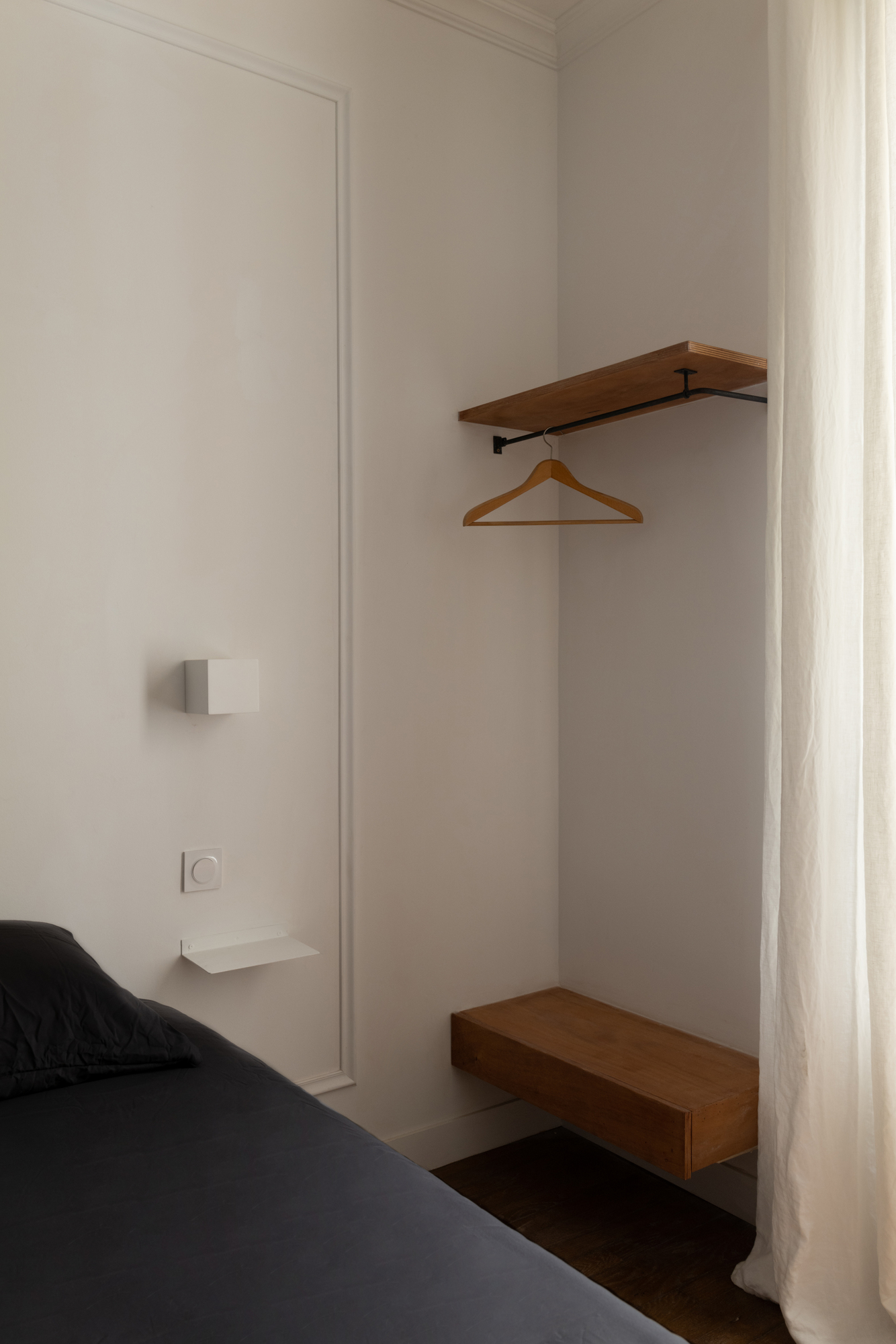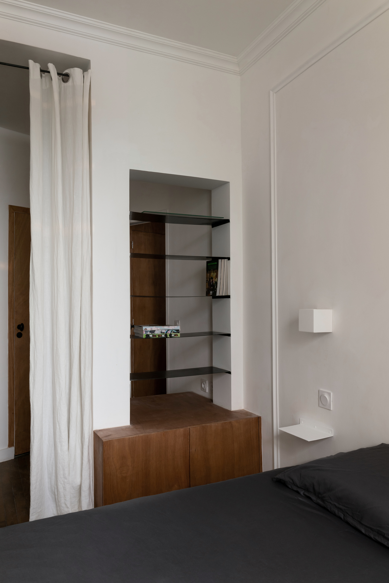 Des éléments historiques ont été soigneusement conservés et valorisés lors de la rénovation. C’est le cas de ces moulures qui matérialisent ainsi la tête de lit. Associées à des rangements très aériens, l’ensemble dégage beaucoup de finesse.