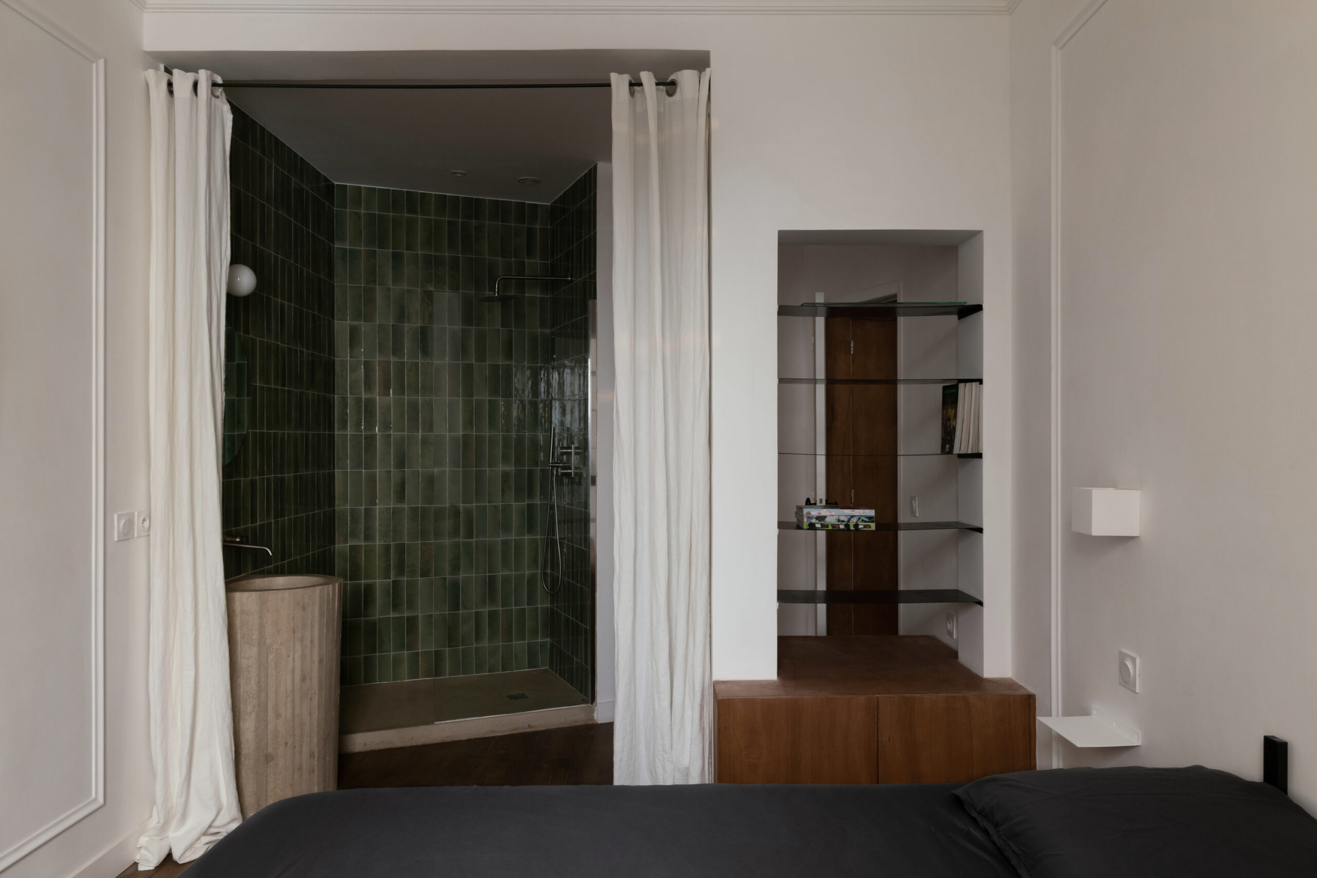Les deux chambres ont été pensées comme des suites d’hôtel. Elles reprennent l’idée du béton, coulé sur place, marié ici à des carreaux de céramique, clin d’œil à la hotte.