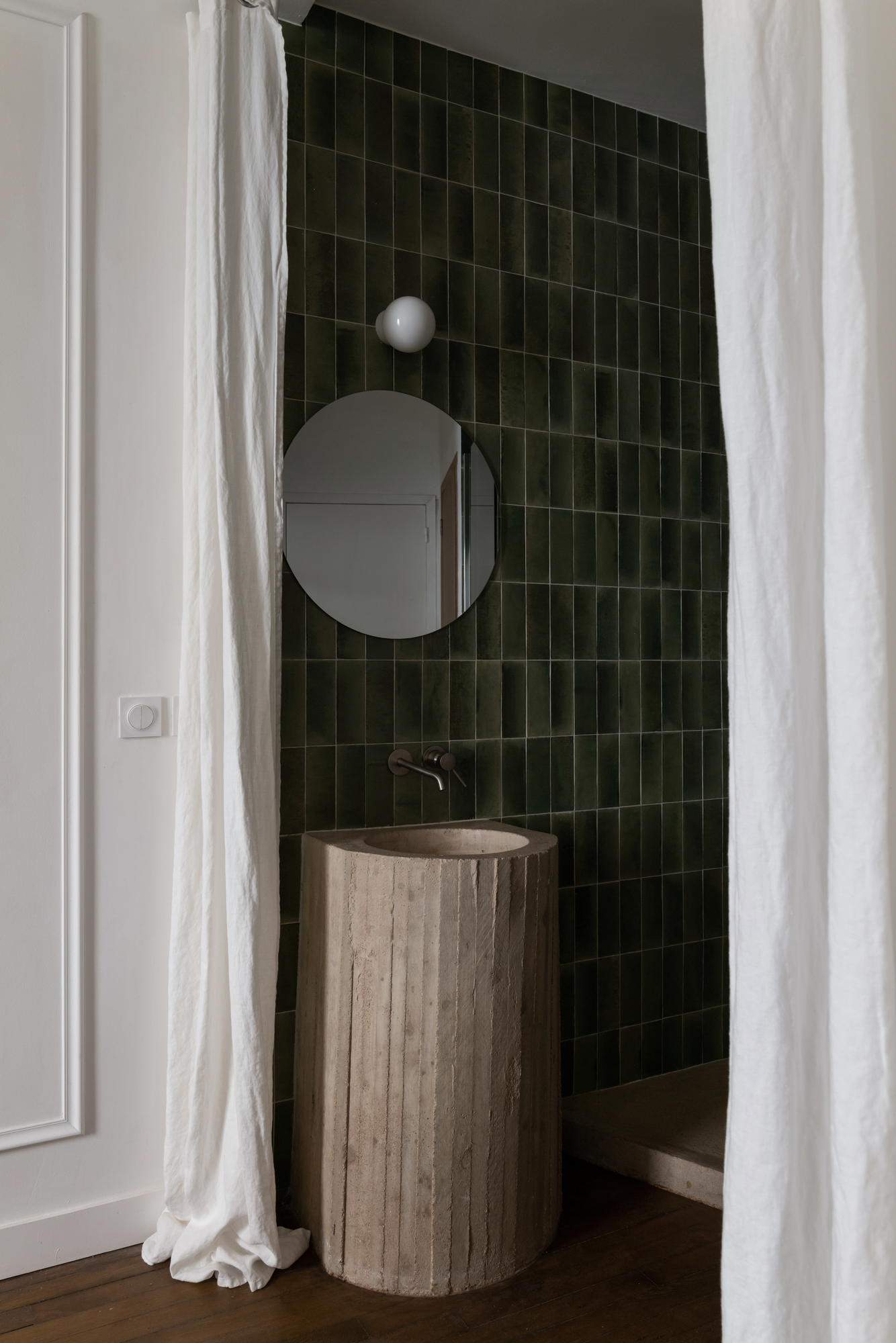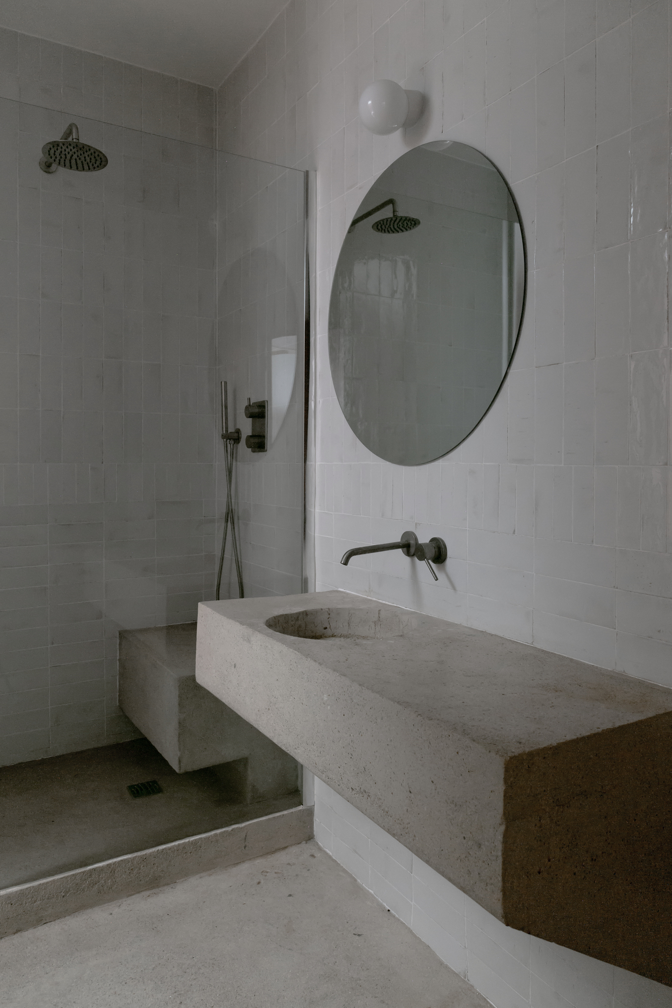 La seconde salle d’eau, si elle intègre le même matériau, reprend les codes brutalistes de la cuisine. Une ambiance différente qui n’empêche pas un trait d’union, établi par les touches de rondeur.