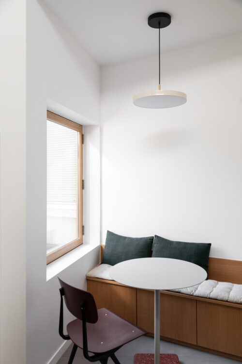 La salle à manger se niche dans une alcôve, où une banquette-rangement en contreplaqué de chêne (Irmaos Enes) dialogue avec une chaise Result de Hay. Des étagères Notes de Cruso complètent l’ensemble, alliant fonctionnalité et élégance.