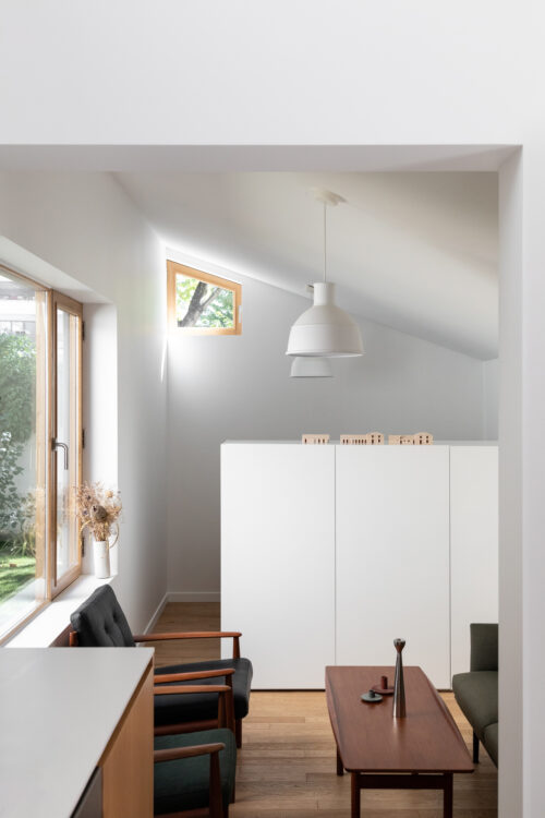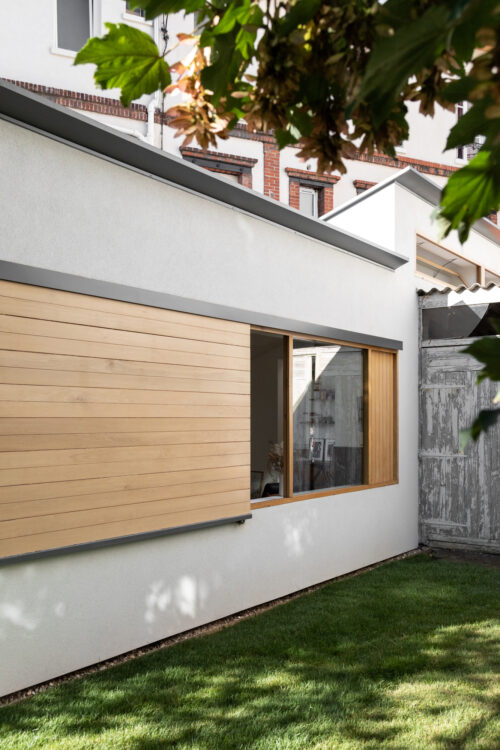 La création d’ouvertures avec volets coulissants, en chêne massif fabriqués artisanalement, a été au cœur du projet. Dessinées pour cadrer des vues sur le jardin et favoriser la ventilation naturelle, elles permettent à la lumière de traverser tout le volume, tout en préservant l’intimité des habitants.