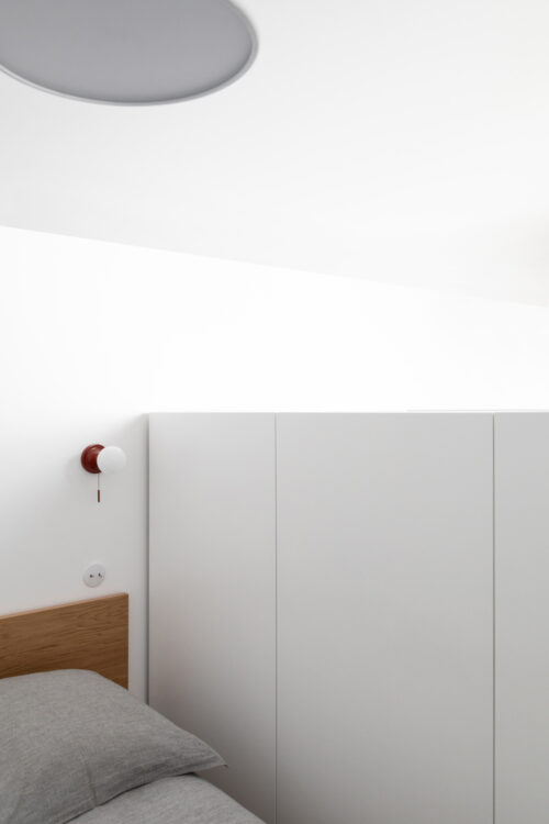 Séparant la chambre du salon, la penderie en MDF laqué Irmaos Enes structure l’espace tout en intégrant de précieux volumes de rangement.