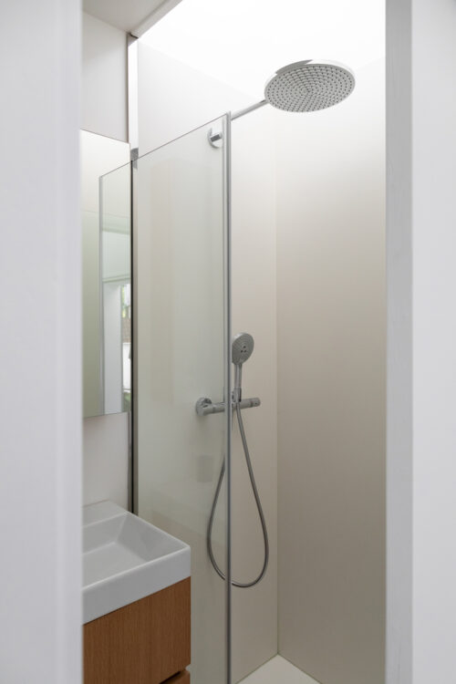 La salle d’eau, baignée de lumière zénithale, reprend les codes de la cuisine : la céramique blanche de la douche dialogue avec le plan de travail, tandis que le meuble vasque en chêne s’inscrit dans la continuité des autres éléments de menuiserie du projet.