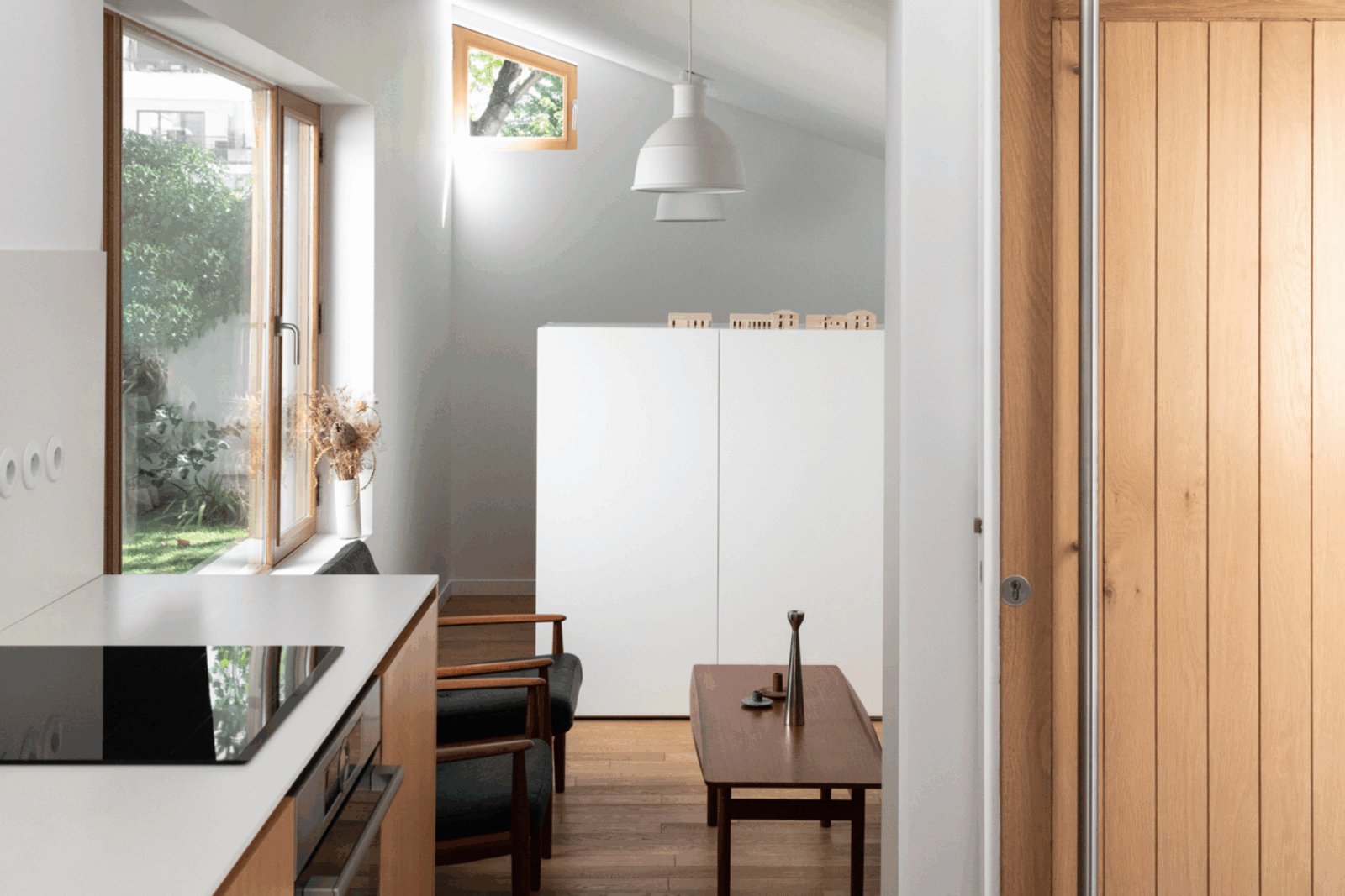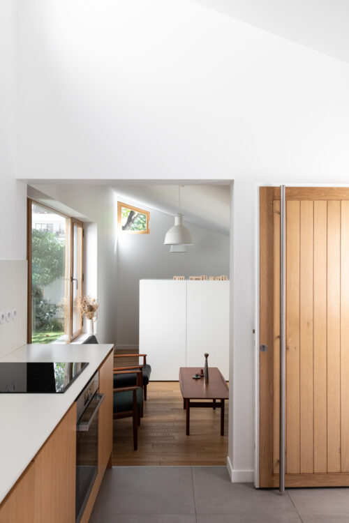 Une marche marque la transition entre le salon et la cuisine, encadrée par une large ouverture dans le mur. En contreplaqué de chêne, les meubles dialoguent avec les menuiseries du studio, tandis que la céramique blanche du plan de travail s’accorde à la teinte immaculée des murs pour renforcer la clarté de l’ensemble.