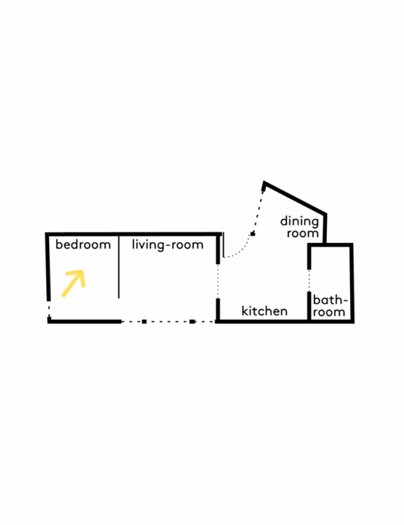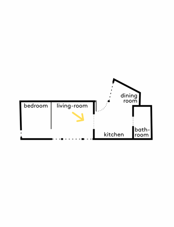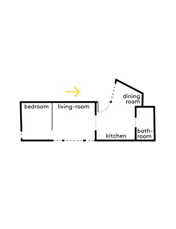 Sans cloisonner le volume, le projet utilise les différences de niveaux et la géométrie du plan pour organiser les fonctions. En enfilade se déploient ainsi la cuisine, le salon et la chambre, offrant une lecture claire et continue de l’espace.