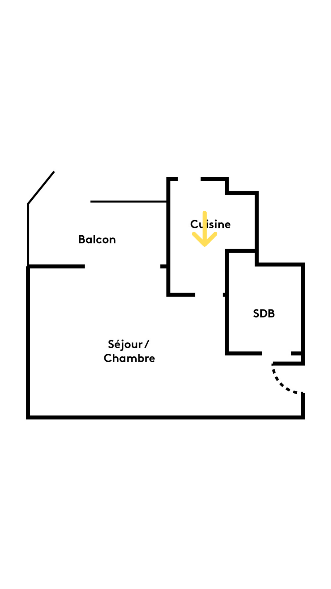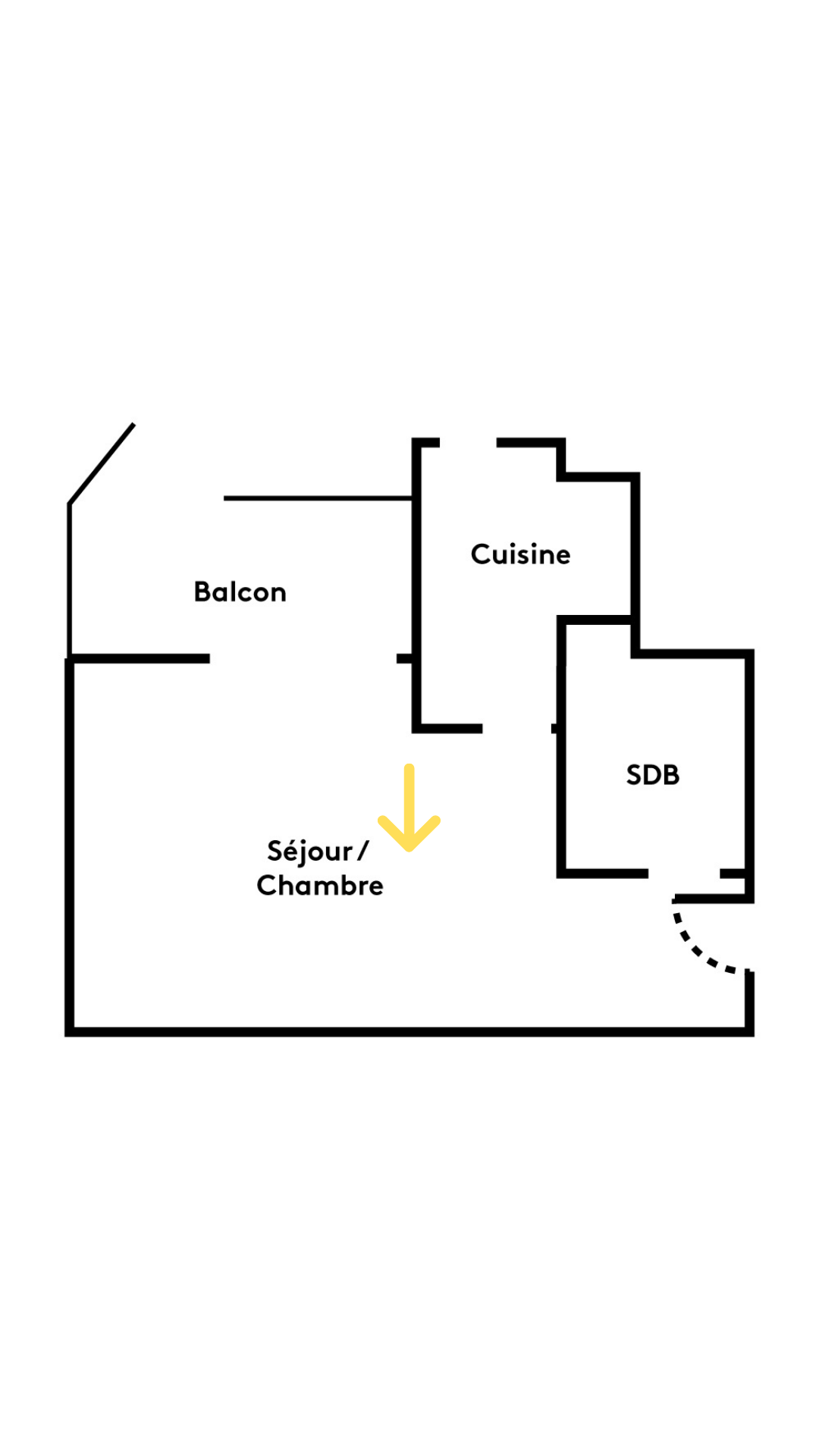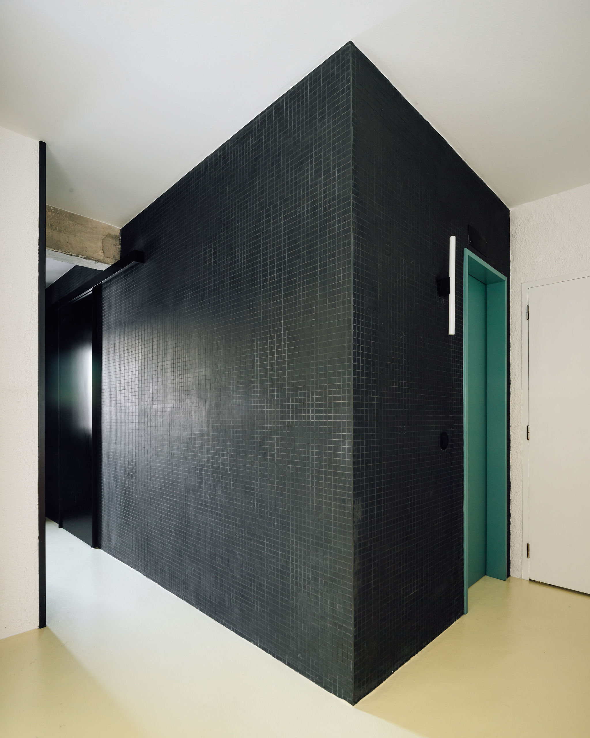 Ce rideau permet de contrôler la relation entre les espaces tout au long de la journée. On remarque à présent le sol en epoxy jaune, qui recouvre en fait l’ensemble de l’appartement !